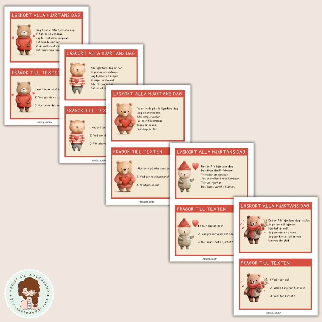 Innehåll: 7 läskort med korta, lättlästa texter på temat Alla hjärtans dag. Texterna består av 6 enkla meningar och är anpassade för elever i årskurs 1–2. Till varje läskort finns 3 enkla läsförståelsefrågor.