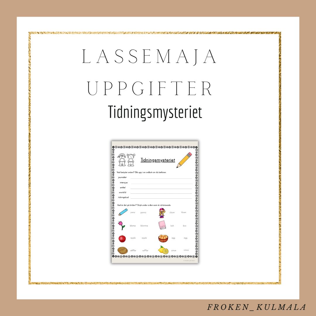 Främja läsning genom att låta barnen läsa boken Lasse Majas detektivbyrå: Tidningsmysteriet av Martin Widmark för att sedan få en arbetsuppgift till boken. Till Tidningsmysteriet får eleven utveckla ordförståelsen och stavning. Följ med Lasse och Maja när de löser olika mysterier. Det rekommenderas att läsa boken Tidningsmysteriet. Dock behöver man inte ha läst boken för att arbeta med arbetsbladet. Arbetsbladet laddas ner och skrivs ut som pdf-fil.