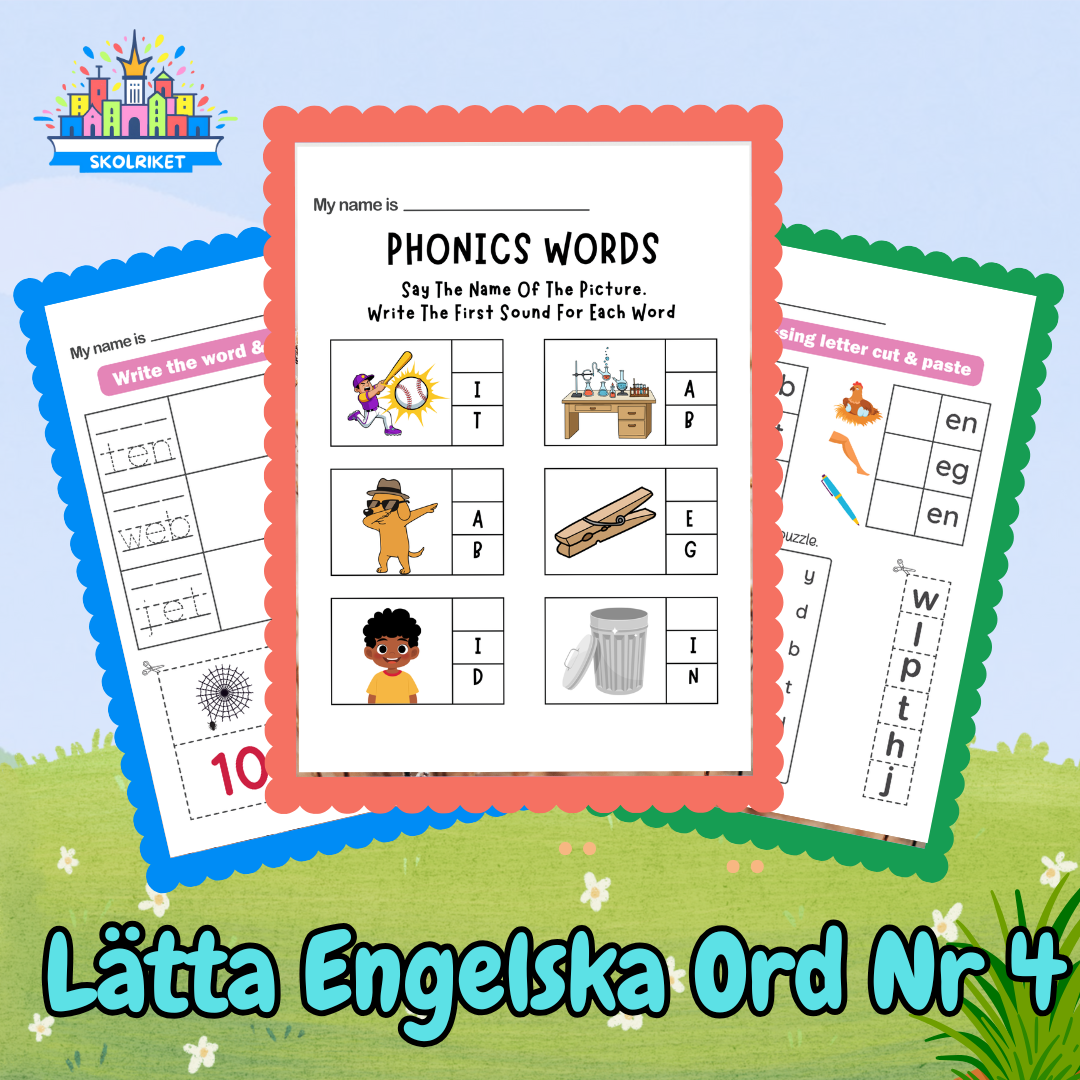 Här får eleverna arbeta med enkla ord som rimmar eller har gemensamma ändelser. Övningarna fokuserar på att skriva, identifiera och koppla rätt ord till rätt bild. Innehåll:– Skrivövning med ord och bilder– Klipp-och-klistra-övning– Ljudlek där eleverna fyller i saknade bokstäver– Ordsök med träningsord– Övning i att identifiera sista ljudet i ord Format: PDF, 3 sidorPassar för: Nybörjare i engelska (förskoleklass – åk 2)Användning: Självständigt arbete, stationer eller extramaterial Perfekt för elever som precis börjat bekanta sig med engelska på ett lekfullt, tydligt och självinstruerande sätt.