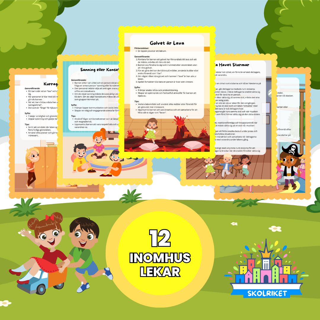 Skapa magiska stunder av lek och glädje med vår samling av tidlösa inomhuslekar. Från ”Golvet är Lava” till ”Kurragömma”, dessa lekar passar alla åldrar och främjar kreativitet och samarbete. Enkla att organisera och fulla av skoj – skapa oförglömliga minnen idag! Ge barnen en chans att skapa underbara minnen och bygga starka vänskapsband genom ”Lekdags! – 12 lekar Inomhus”
