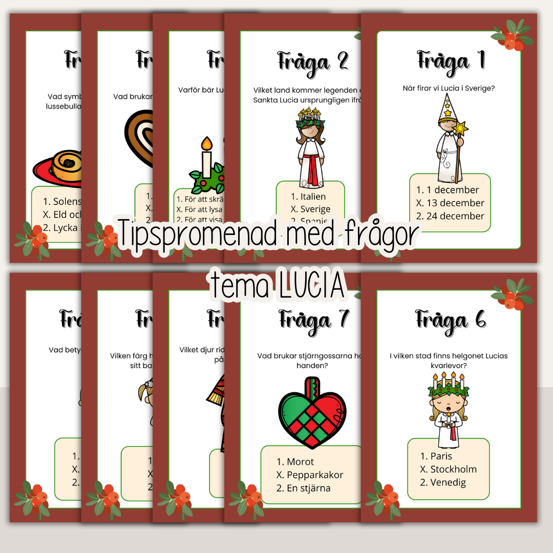 En tipspromenad med frågor om Lucia och Luciafirande. 10 frågor med facit och svarstalonger. Levereras som PDF-fil - färdigt att skriva ut och använda.