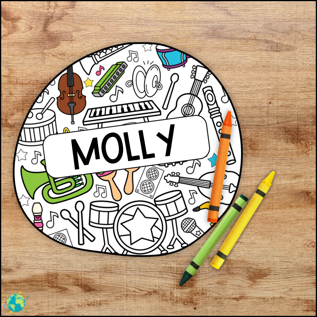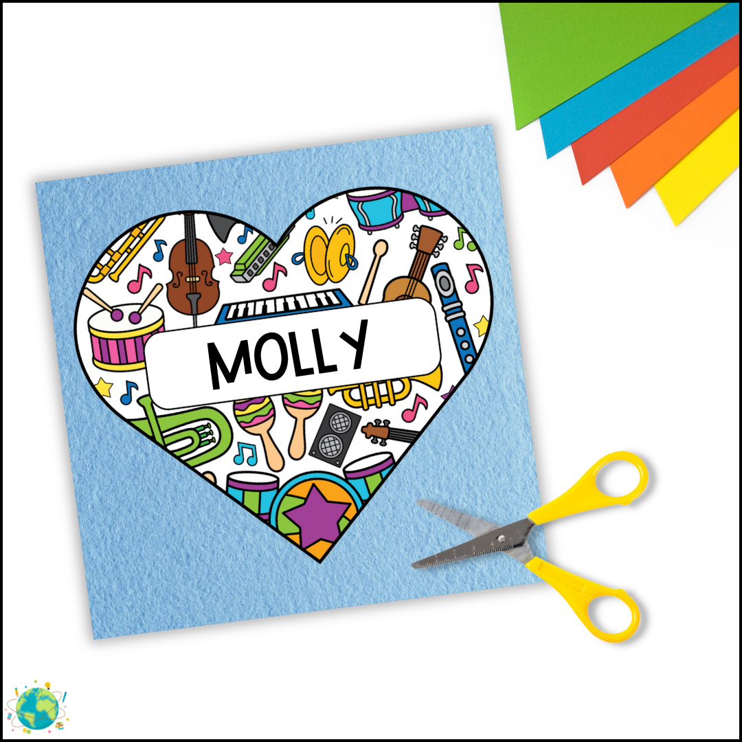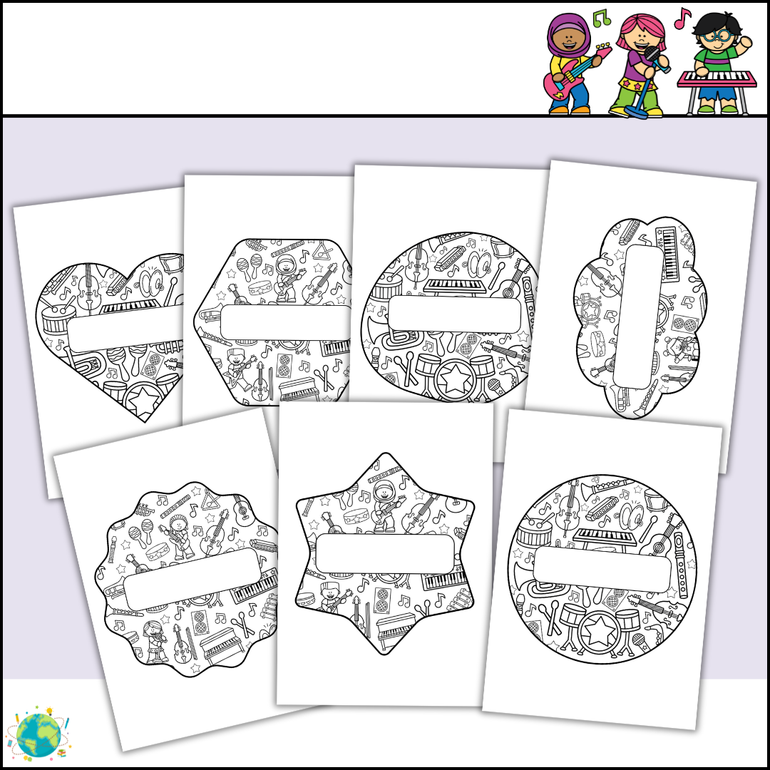 En kreativ uppgift att arbeta med under första skolveckan eller när man behöver nya namnskyltar. PDF: A4 28 stycken 7 former tema musik