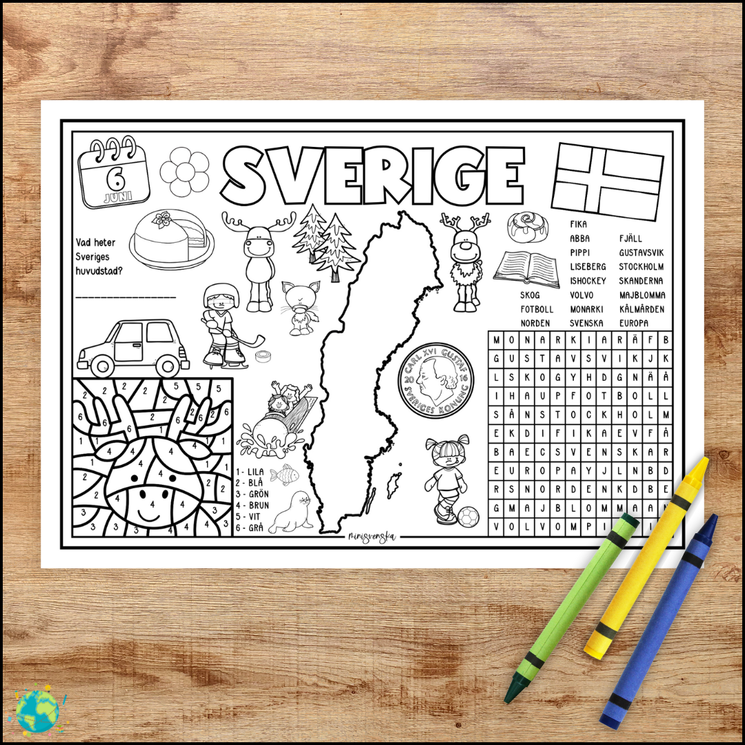 Ett roligt och lärorikt arbetsblad där eleverna får upptäcka Sverige genom färgläggning, ordjakt och enkla faktauppgifter.