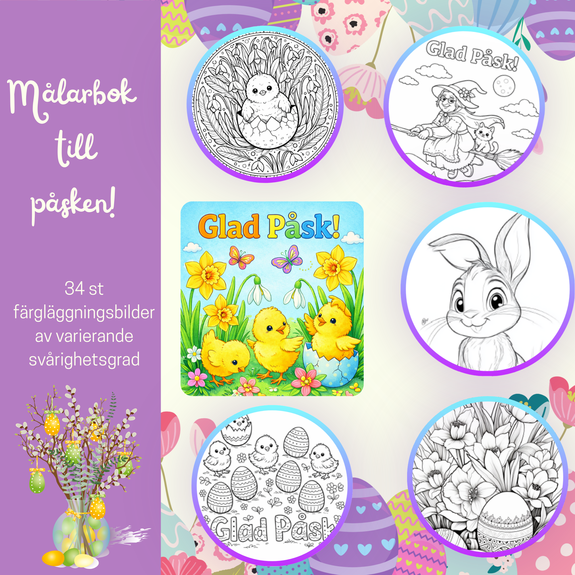 I det här häftet finns det 34 färgläggningsbilder av olika svårighetsgrader. Kommer i format A4 men det går såklart fint att skriva ut dem i mindre storlekar och ha som påskkort.