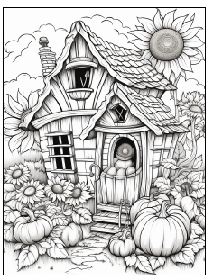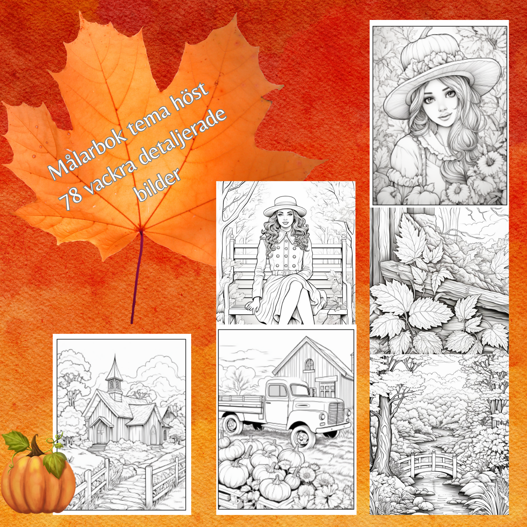 Stor målarbok med 78 målarbilder med hösttema. Detaljerade landskapsbilder och även några med designen av kyrkfönster.