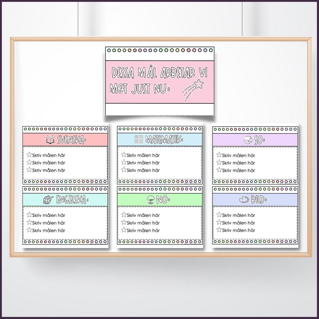 Samtliga mållappar finns i kursivt respektive neutralt typsnitt och har bildstöd. Välj själv om du vill skriva ut dem i PDF och skriva målen för hand eller använda den redigerbara versionen och skriva in målen i datorn före utskrift.