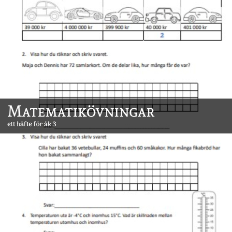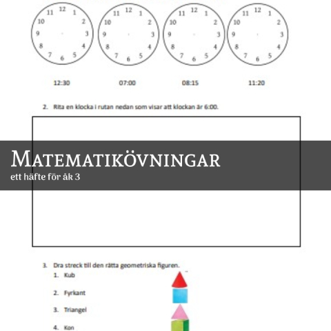 Blandade övningar samlade i ett häfte på 5 sidor + en framsida som kan färgläggas. – talområdet 0-100– additions- och subtraktionsbegreppen– textuppgifter– geometriska figurer– klockan
