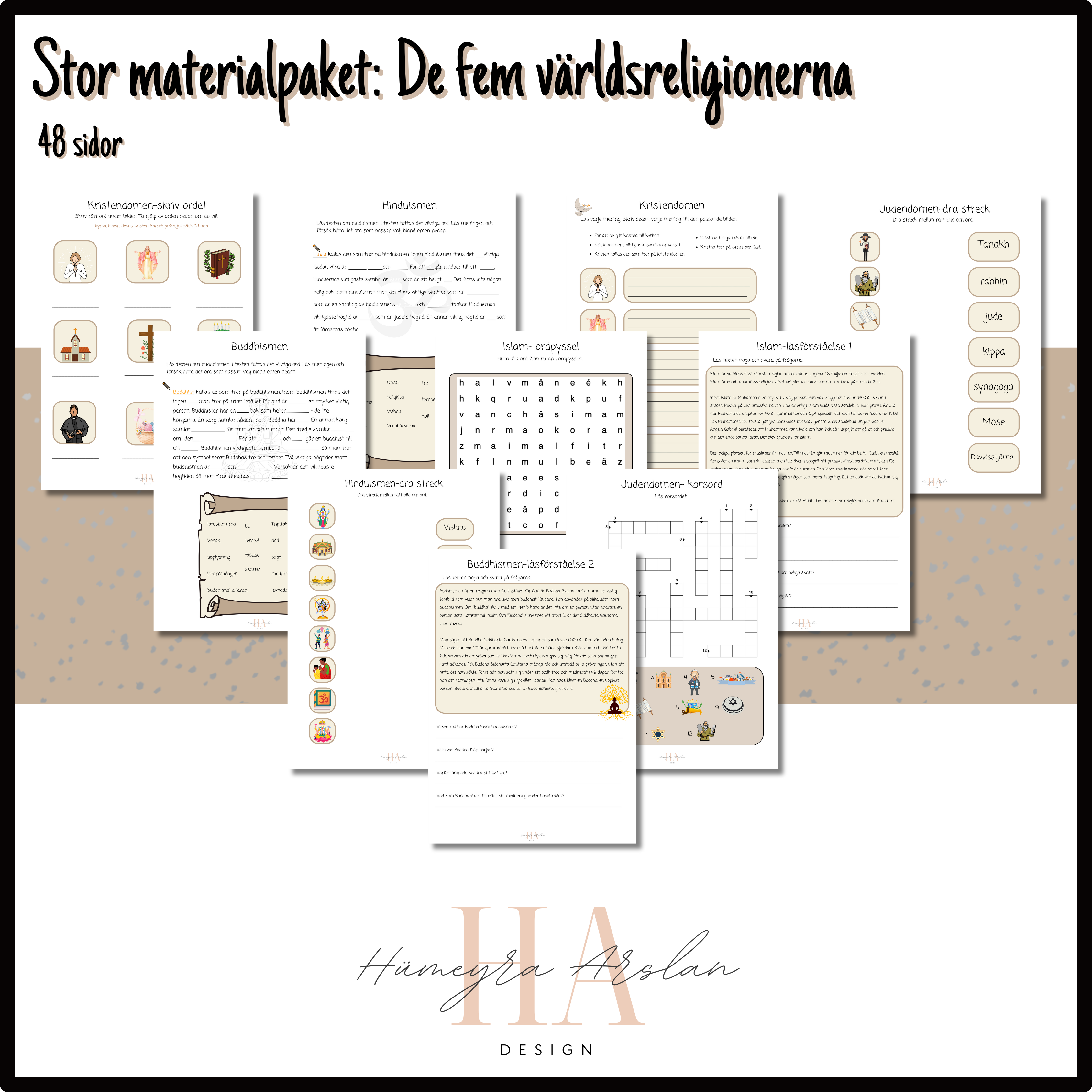 ”Materialpaket: De fem världsreligionerna” är ett materialpaket på hela 48 sidor. Paketet innehåller följande: