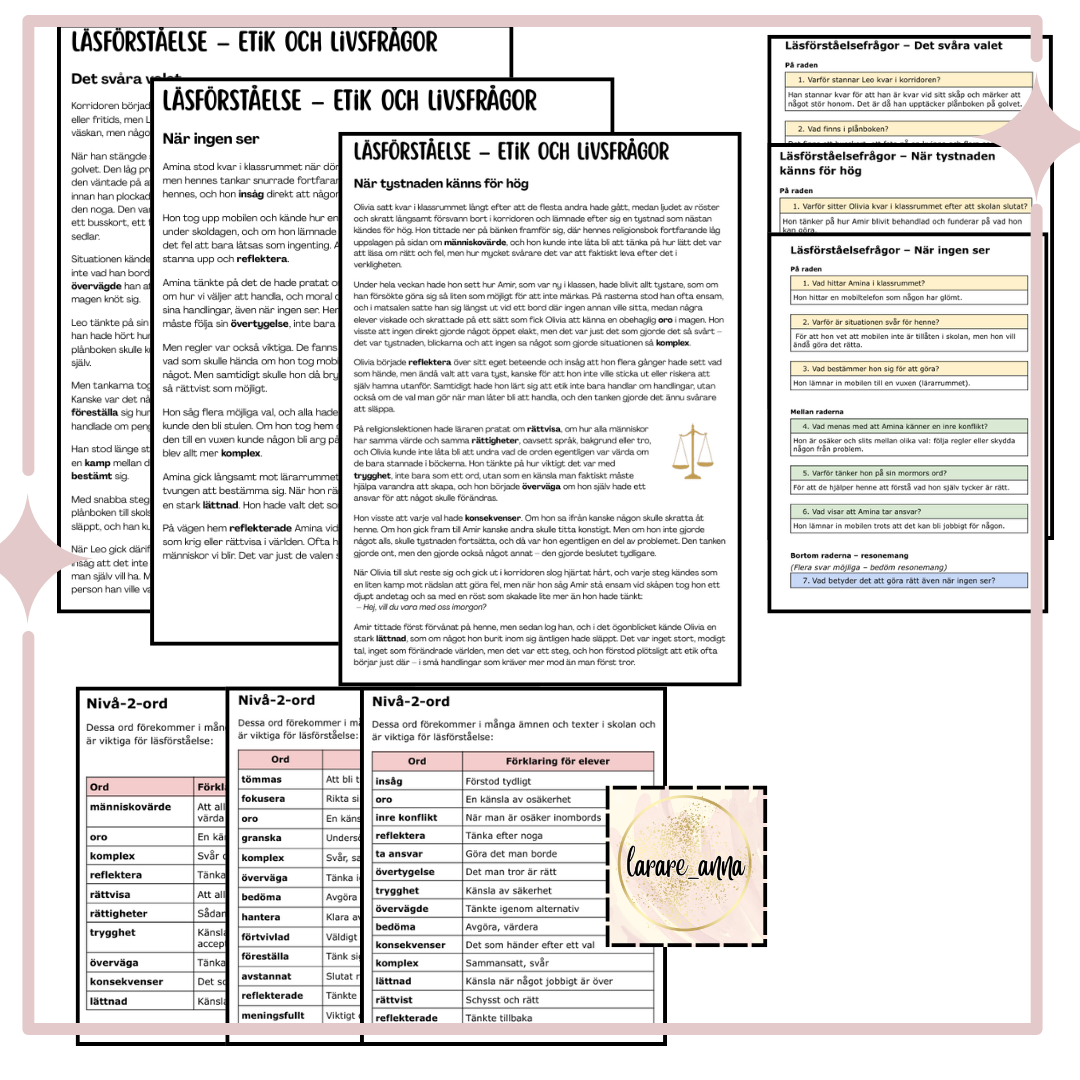 Ett färdigt och genomarbetat material med tre berättande läsförståelsetexter som lyfter etik, moral och livsfrågor ur elevernas vardag. Texterna är anpassade för årskurs 6 och fungerar lika bra i religion som i svenska för träning av läsförståelse och resonemang.