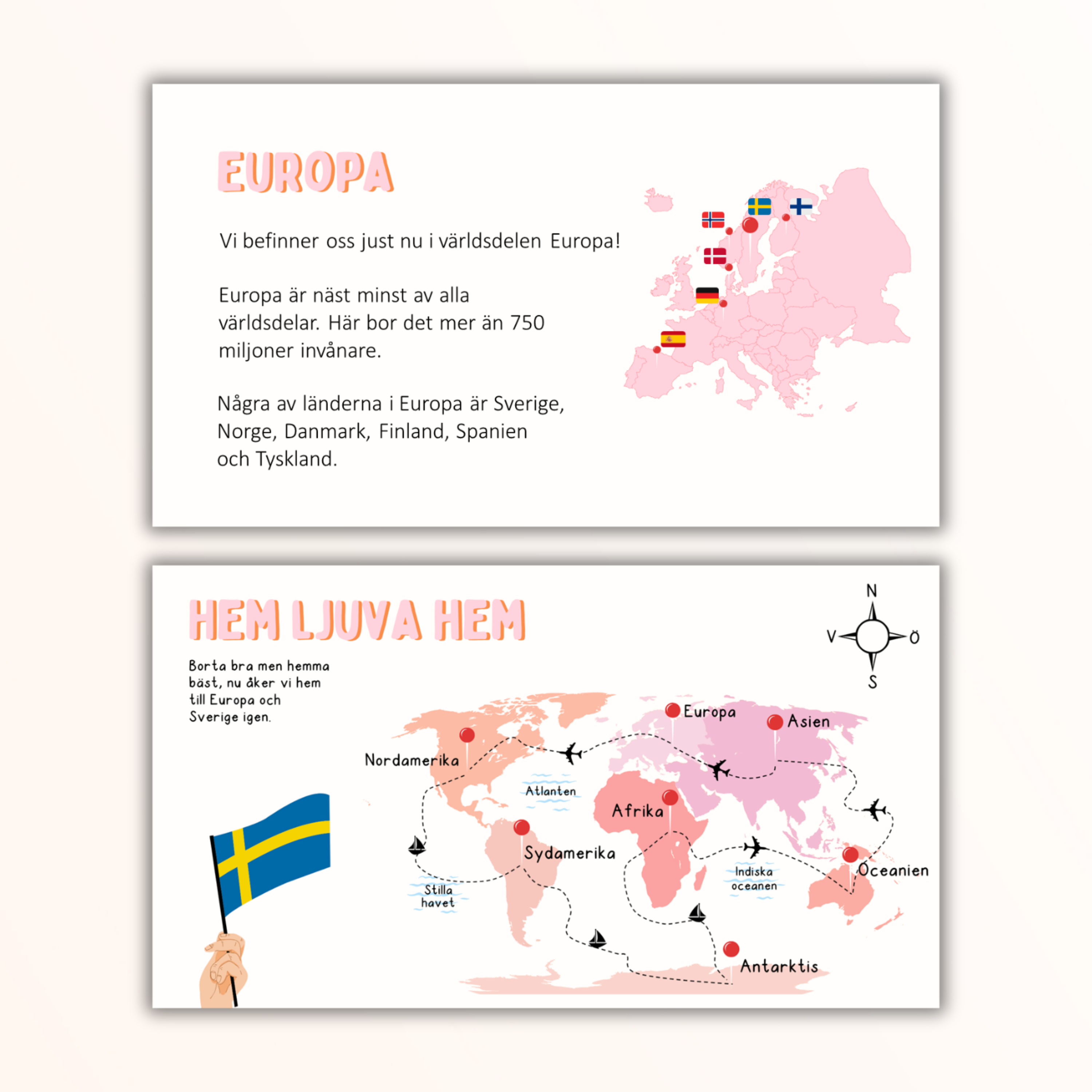 Paketet innehåller en redigerbar powerpointpresentation på totalt 32 sidor. Först ges en översiktlig beskrivning av världsdelarna, världshaven samt väderstrecken. Sedan börjar resan genom världsdelarna där eleverna får lära sig fakta om världsdelen. Efter varje världsdel får klassen även ett vykort av en hemlig resenär. (Detta går att spinna vidare mer på om man vill, till exempel genom att skicka ett riktigt vykort till klassen eller att låta de elever som är klara snabbt svara på vykorten. Mall för detta finns med i paketet.)
