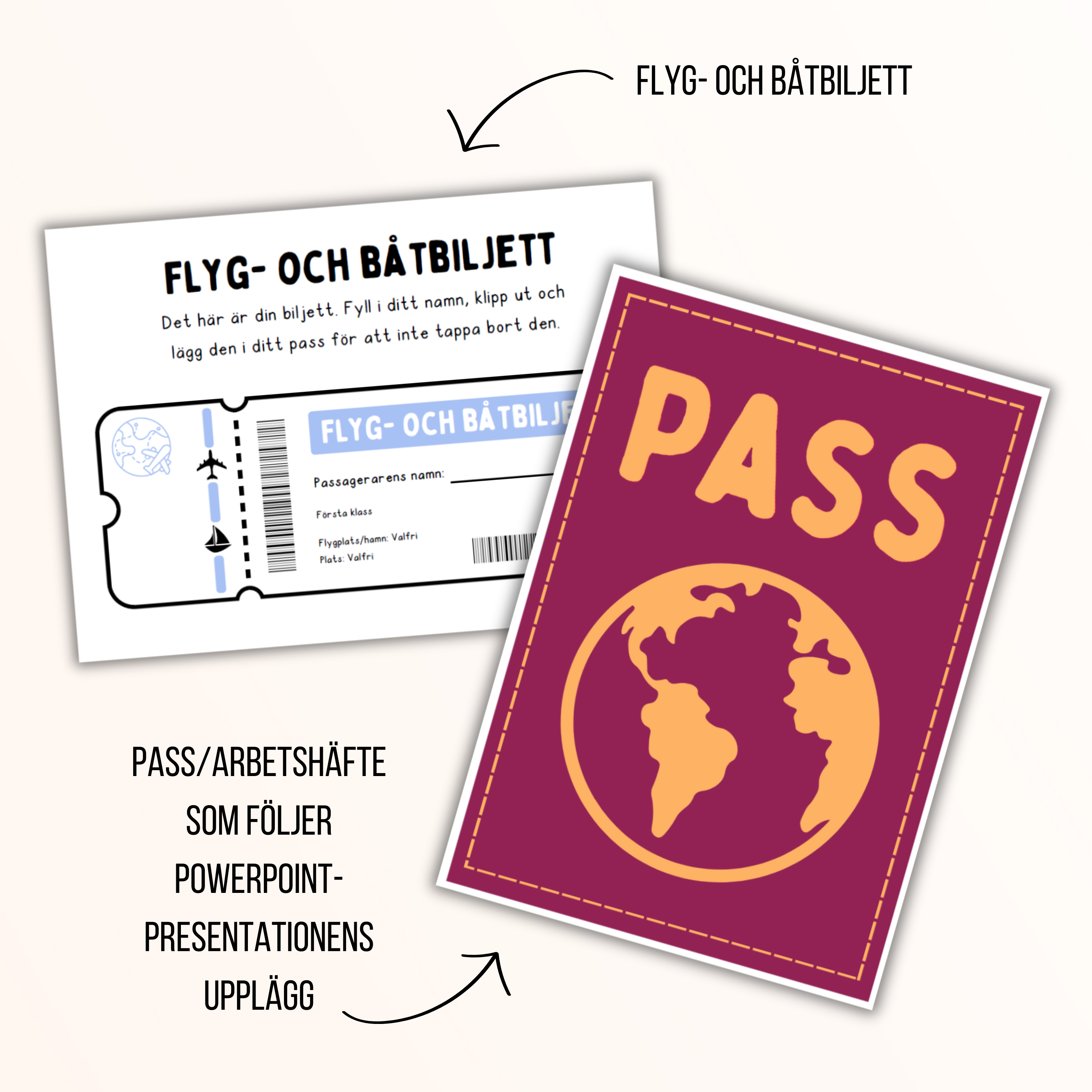 I paketet ingår även ett arbetshäfte som ser ut som ett pass. Där ska eleverna skriva in vilka världsdelar de har besökt och vilka världshav de har rest över. De ska också skriva fakta om alla världsdelar. Ordningen i arbetshäftet är densamma som i powerpointpresentationen.