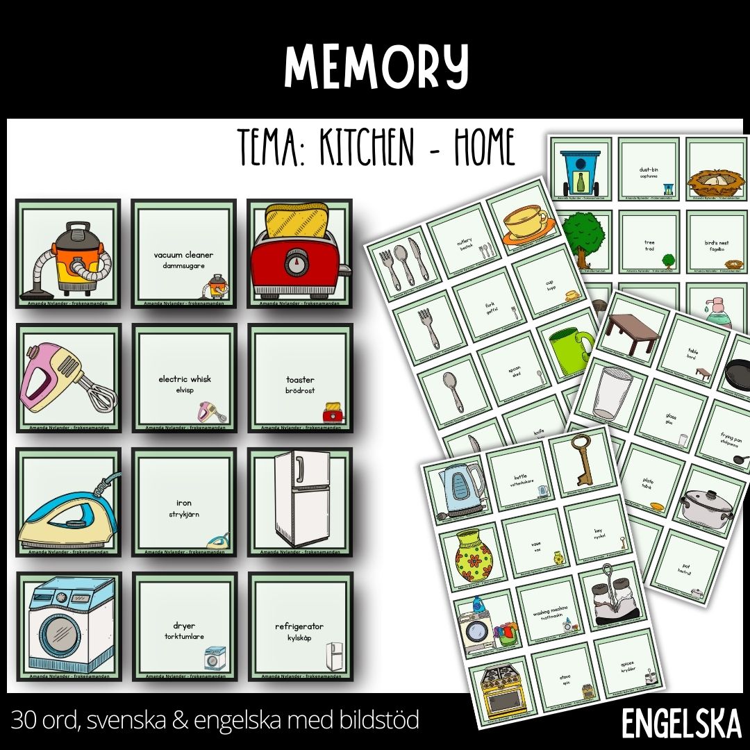 Klassiskt Memory (i par): Eleverna turas om att hitta bildkortet som matchar rätt ordkort. För att öka lärandet måste eleven uttala ordet på engelska och säga den svenska översättningen (t.ex. ”vacuum cleaner – dammsugare”) för att få behålla paret.