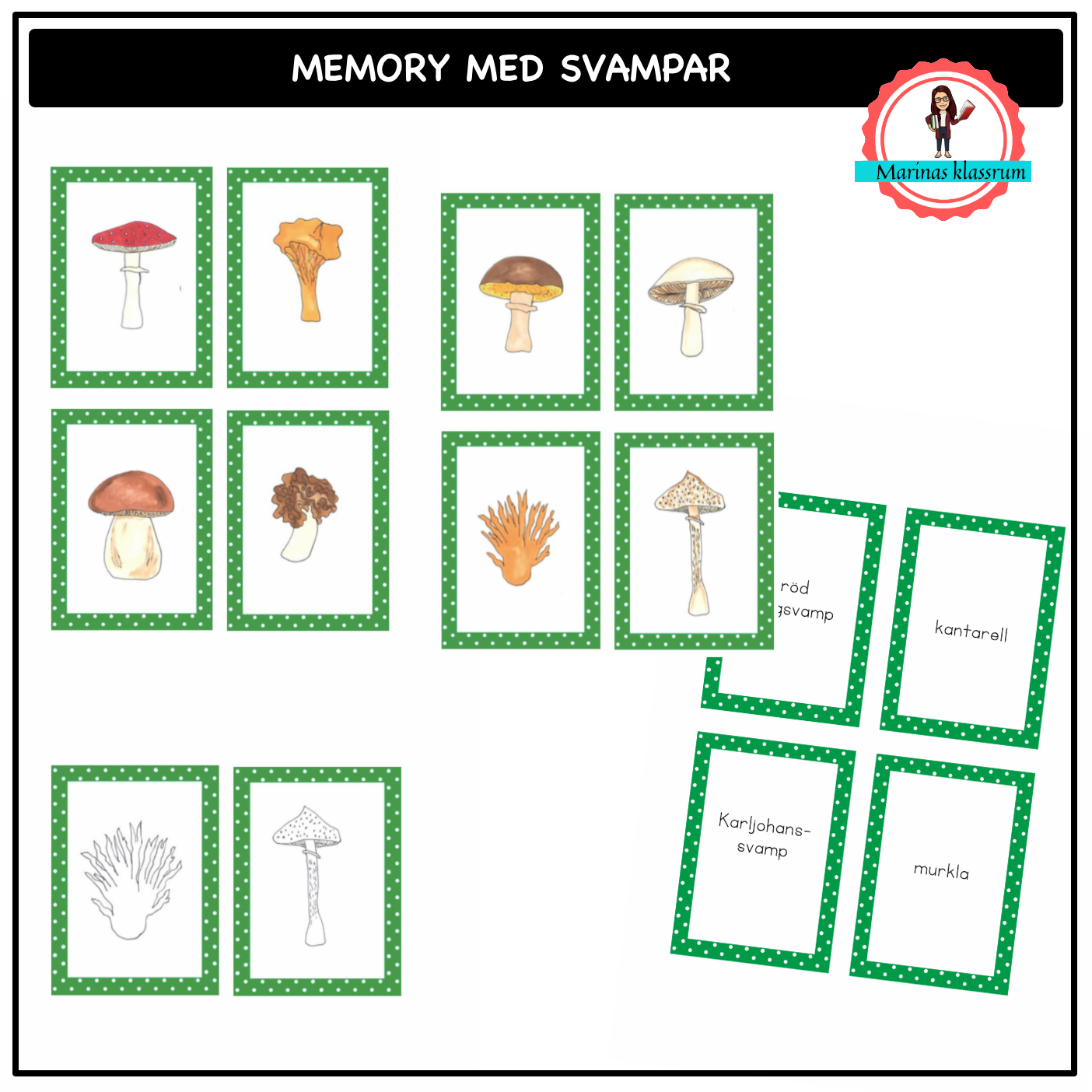 Träna på 11 av våra vanligaste svampar i skogen. Karljohanssvamp, gul fingersvamp, röd flugsvamp, taggsvamp, röksvamp, murkla, blodriska, champinjon, stolt fjällskivling, smörsopp och kantarell. Materielet finns både i färg och svartvitt.