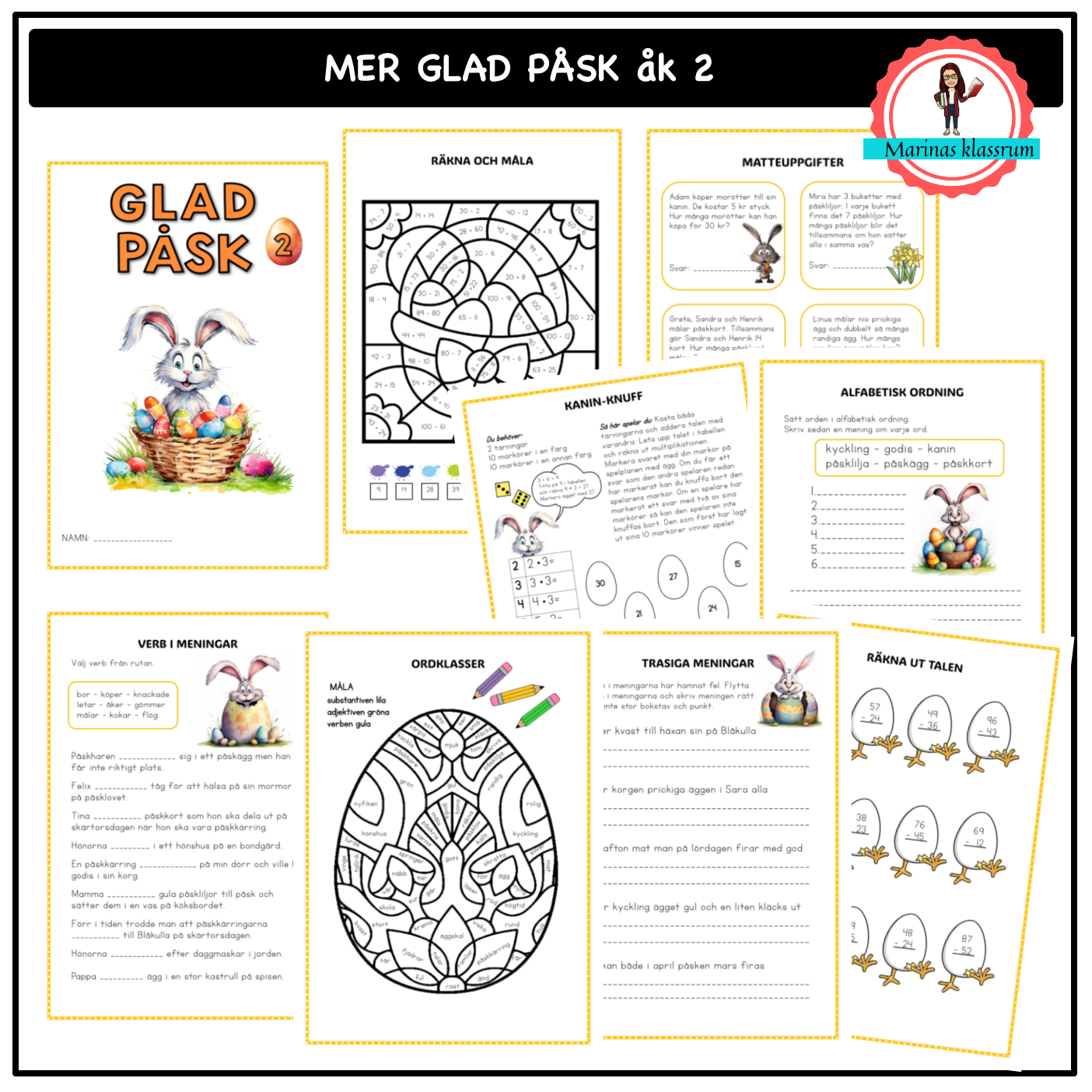 Ett påskhäfte med blandade uppgifter i matte och svenska. Arbetsuppgifter på 12 sidor som passar för åk 2.