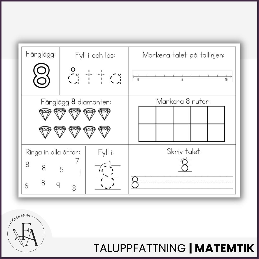 I detta material får eleverna arbeta med talen/siffrorna 0-9 på olika sätt. Presentera med fördel ett tal / en siffra i veckan och ge eleverna ett arbetsblad i veckan alternativt använd som extramaterial. Varje arbetsblad följer samma struktur som eleverna snabbt lär sig att känna igen och förstår. Materialet är i A4 men kan kopieras i A5 om man önskar ett mindre format.
