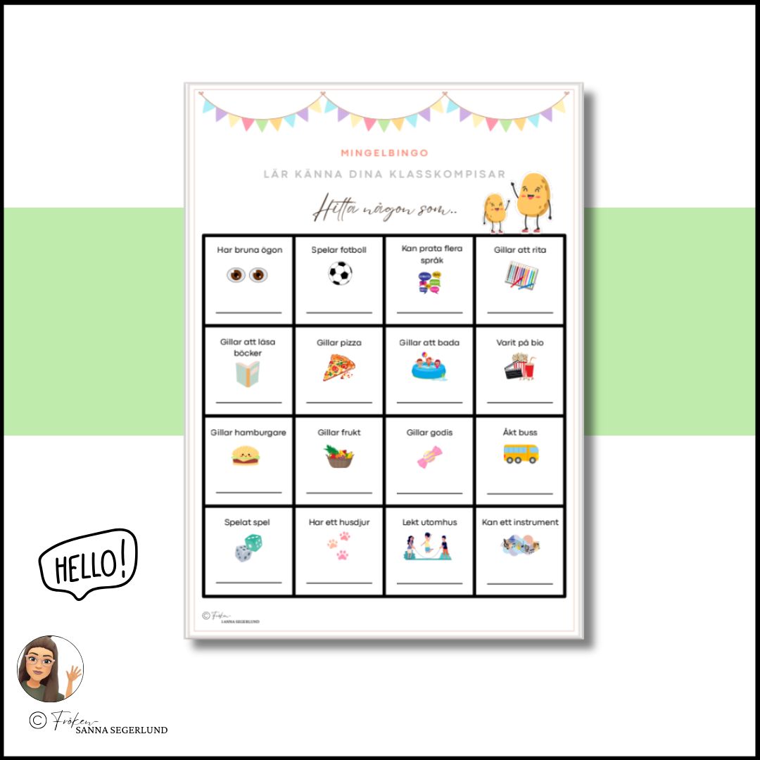 Mingelbingo – Skolstart 🐞📚 Ett lekfullt sätt för eleverna att lära känna varandra redan första dagarna i skolan! 🌟Mingelbingo är en social aktivitet där eleverna får röra på sig, prata med varandra och leta efter kompisar som stämmer in på olika påståenden. Aktiviteten skapar gemenskap och gör det lättare att börja prata med nya klasskompisar. Exempel på rutor i bingot:Hitta någon som ”Har ett husdjur” 🐕Hitta någon som ”Gillar glass” 🍦 Så funkar det:Eleverna går runt i klassrummet med sina bingobrickor, minglar och letar efter kompisar som matchar påståendena. När de hittar någon skriver de ner namnet i rutan.