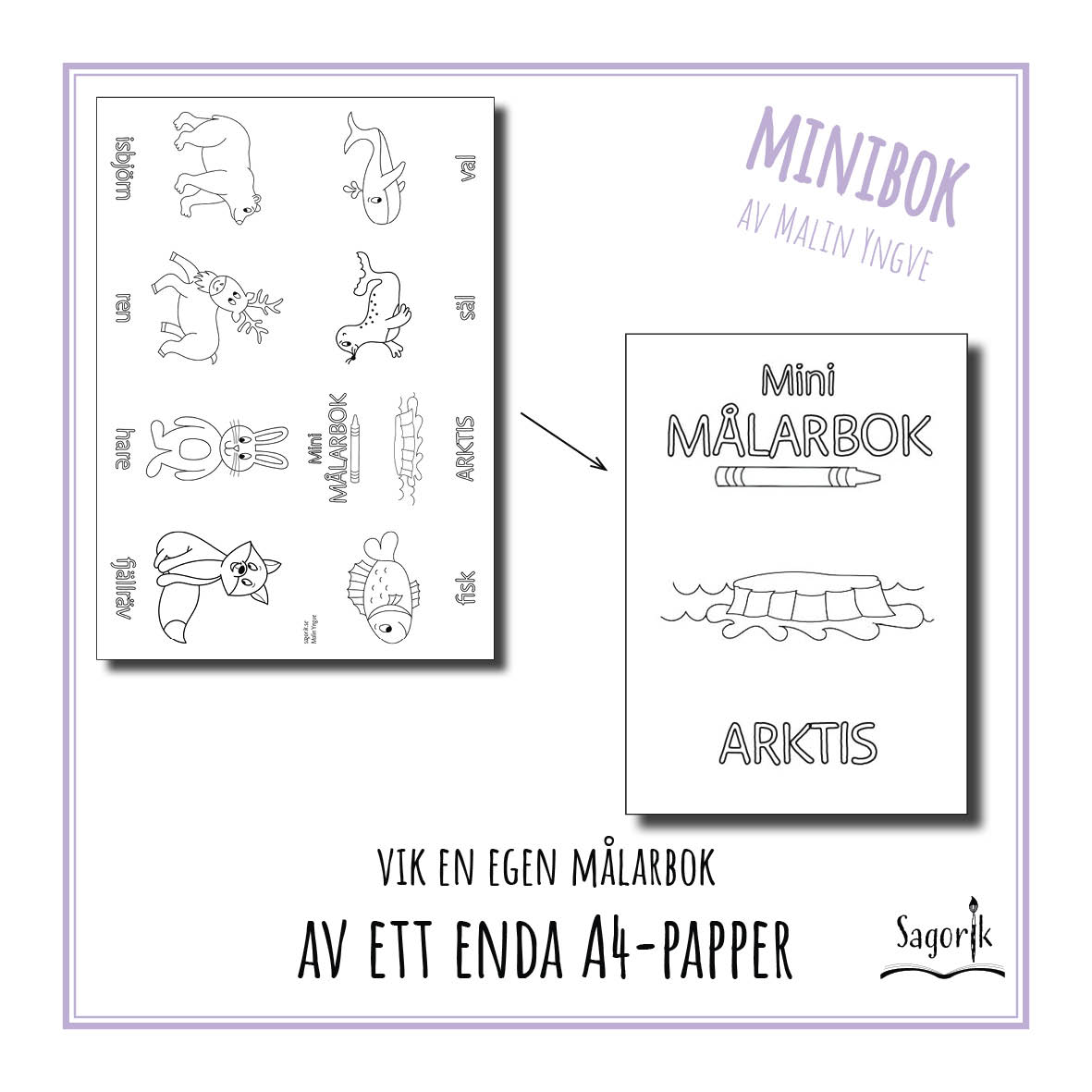 Vik en minibok av ett enda A4-papper! Färglägg sedan bilderna som i en vanlig målarbok. På varje sida finns ett ord att färglägga som beskriver vad bilden föreställer. Det främjar den tidiga läsinlärningen och barnets läsförståelse tränas på ett enkelt och lustfyllt sätt. Låt barnen/eleverna följa instruktionerna och vika sin egen minibok, eller vik och ge dem som present inför t ex ett lov. Minimålarböcker passar även som startuppgift i skolan och som extrauppgift för de elever som blir klara med lektionens planerade uppgifter i förtid. Instruktioner till hur du viker boken medföljer. Mina miniböcker finns i många olika teman. Design och illustrationer av Malin Yngve.