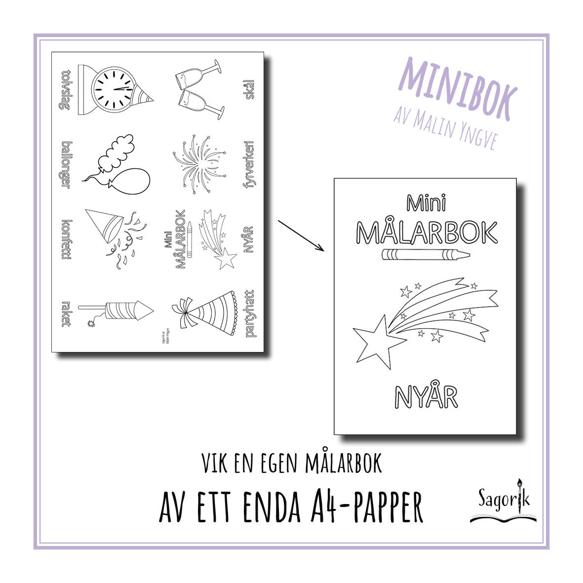 Vik en minibok av ett enda A4-papper! Färglägg sedan bilderna som i en vanlig målarbok. På varje sida finns ett ord att färglägga som beskriver vad bilden föreställer. Det främjar den tidiga läsinlärningen och barnets läsförståelse tränas på ett enkelt och lustfyllt sätt. Låt barnen/eleverna följa instruktionerna och vika sin egen minibok, eller vik och ge dem som present inför t ex ett lov. Minimålarböcker passar även som startuppgift i skolan och som extrauppgift för de elever som blir klara med lektionens planerade uppgifter i förtid. Instruktioner till hur du viker boken medföljer. Mina miniböcker finns i många olika teman. Design och illustrationer av Malin Yngve.