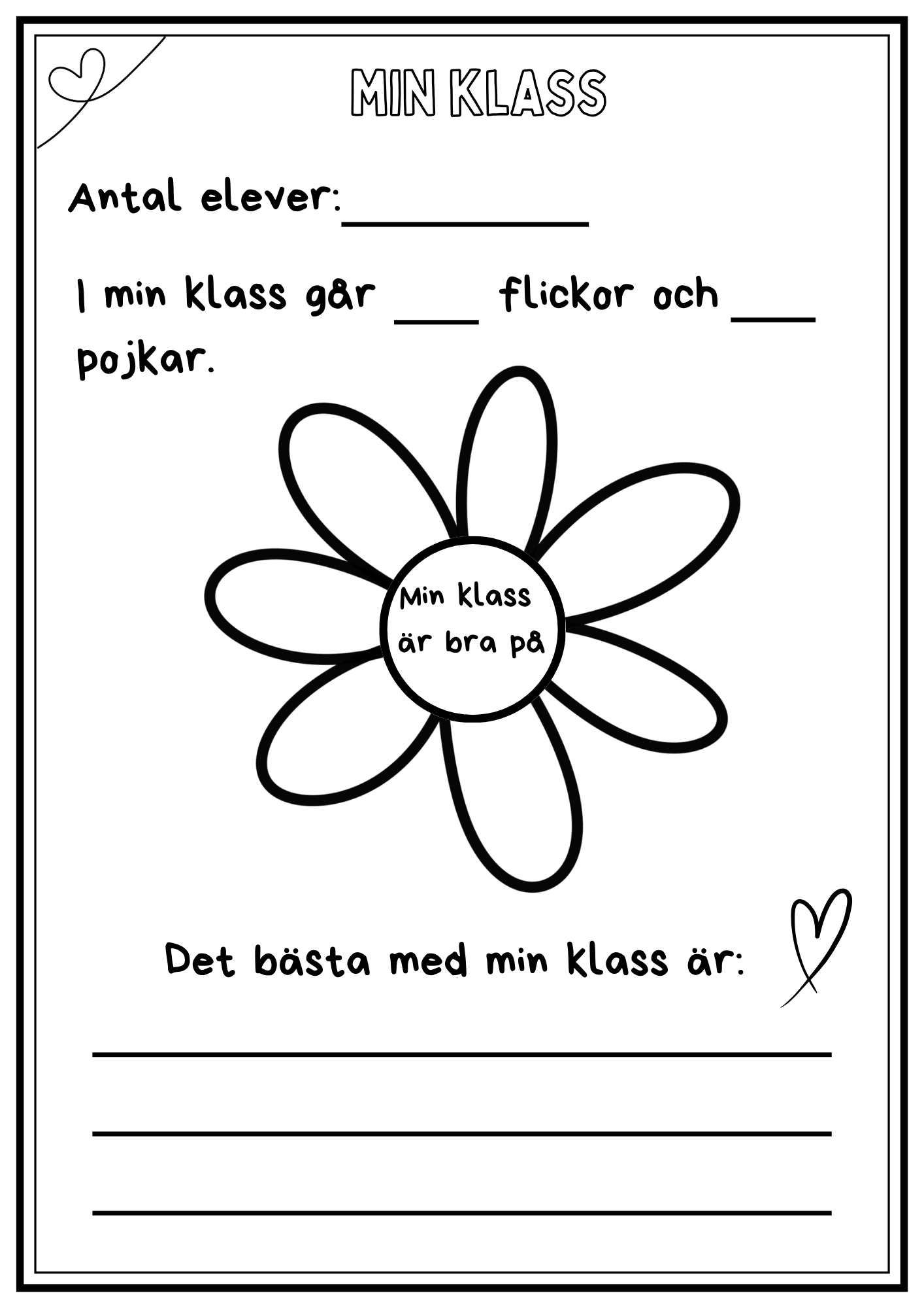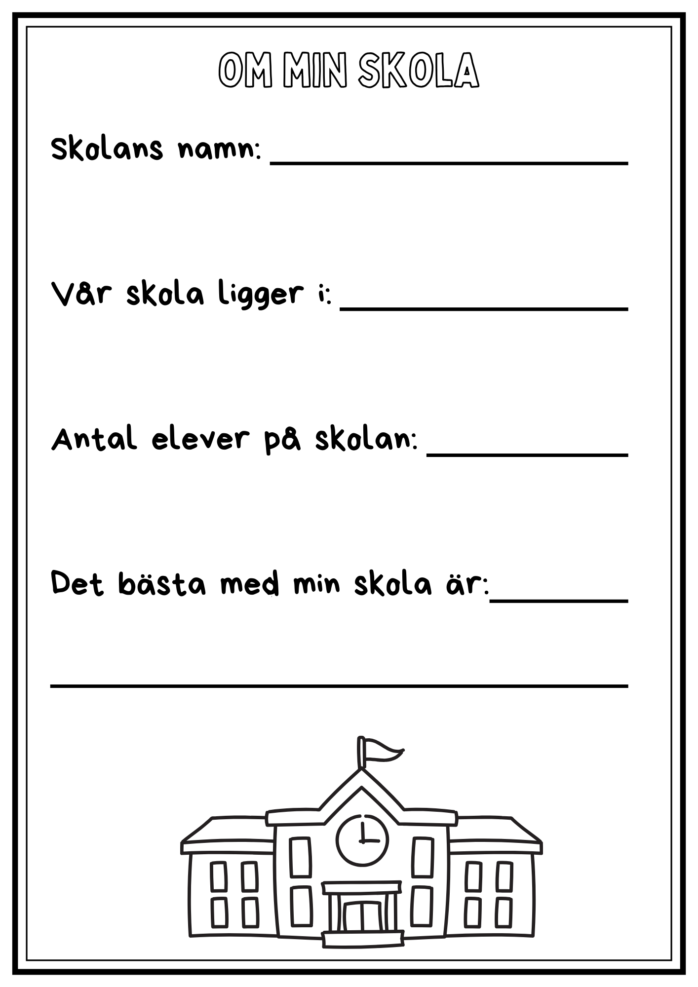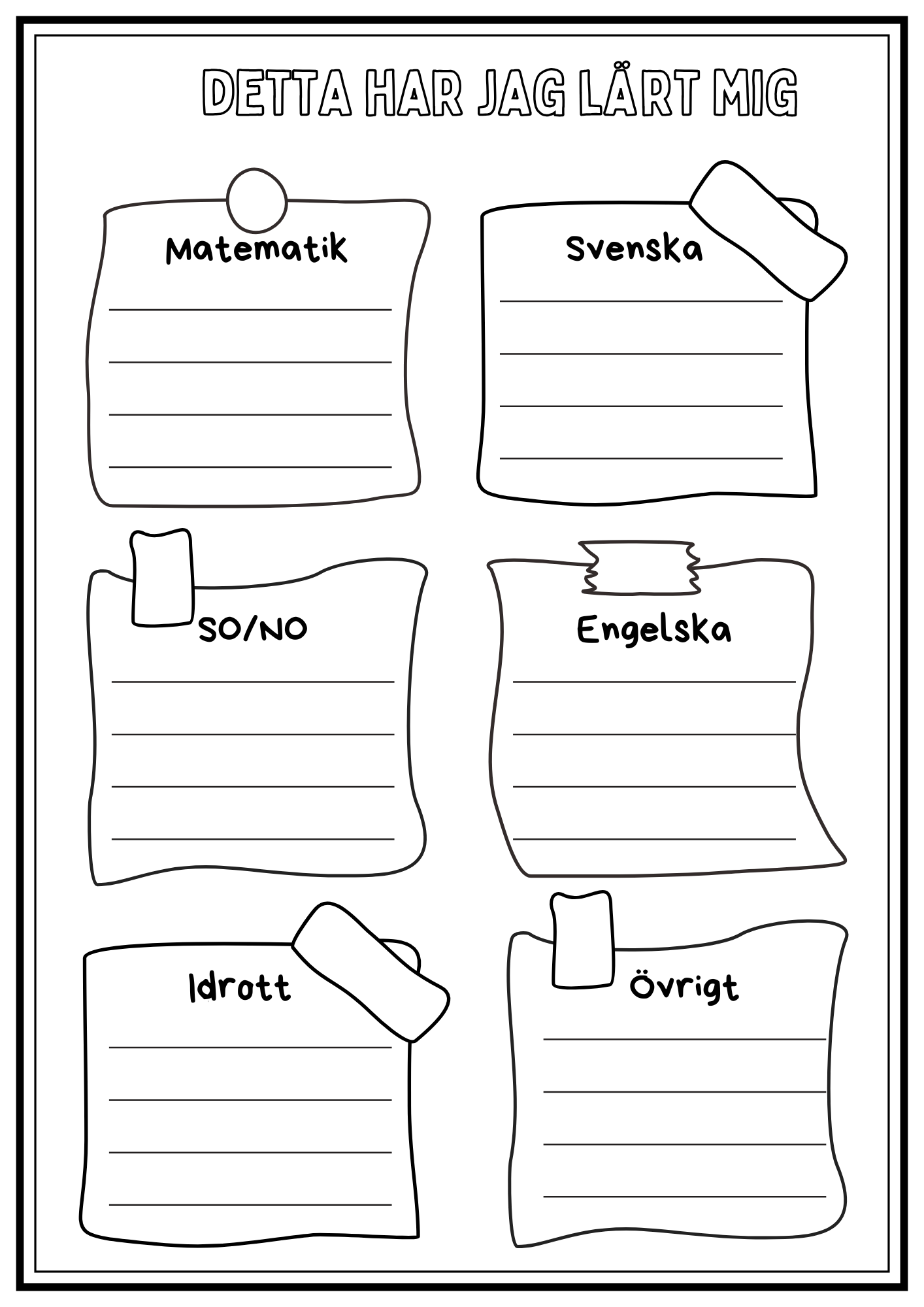 Minnesbok från läsåret. Eleverna skriver om sin skola, sin klass, lärare, saker de lärt sig osv. Plocka ut delar som passar eller använd allt! Totalt 18 sidor plus framsida. Framsidan är anpassad för förskoleklass – årskurs 6.