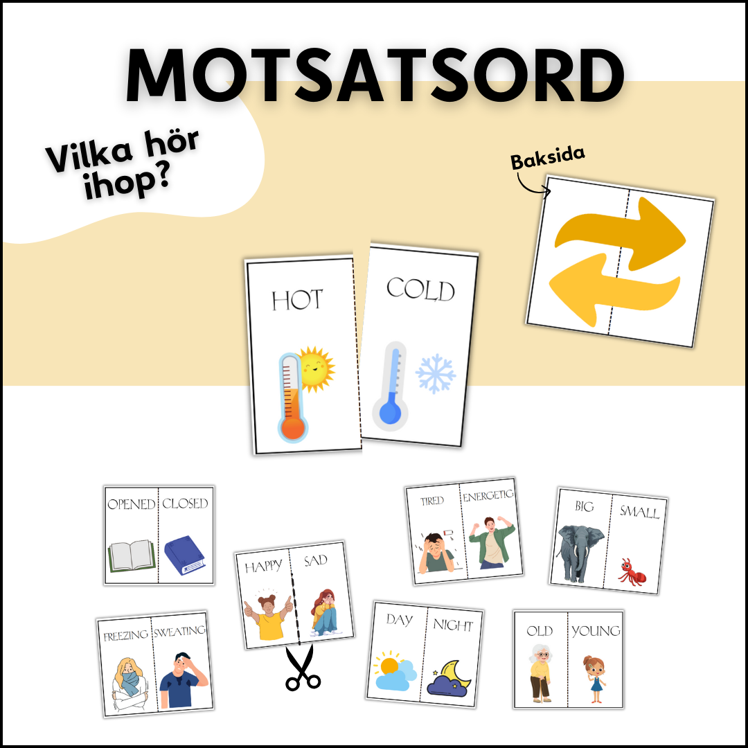 Jag har skapat kort där eleverna ska para ihop motsatsord på engelska. Korten har en fram och baksida så att eleverna ser om korten hör ihop. Det är totalt 22 motsatsord (44 kort).