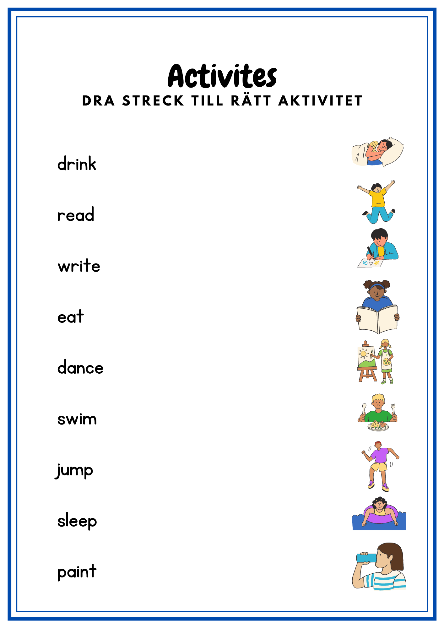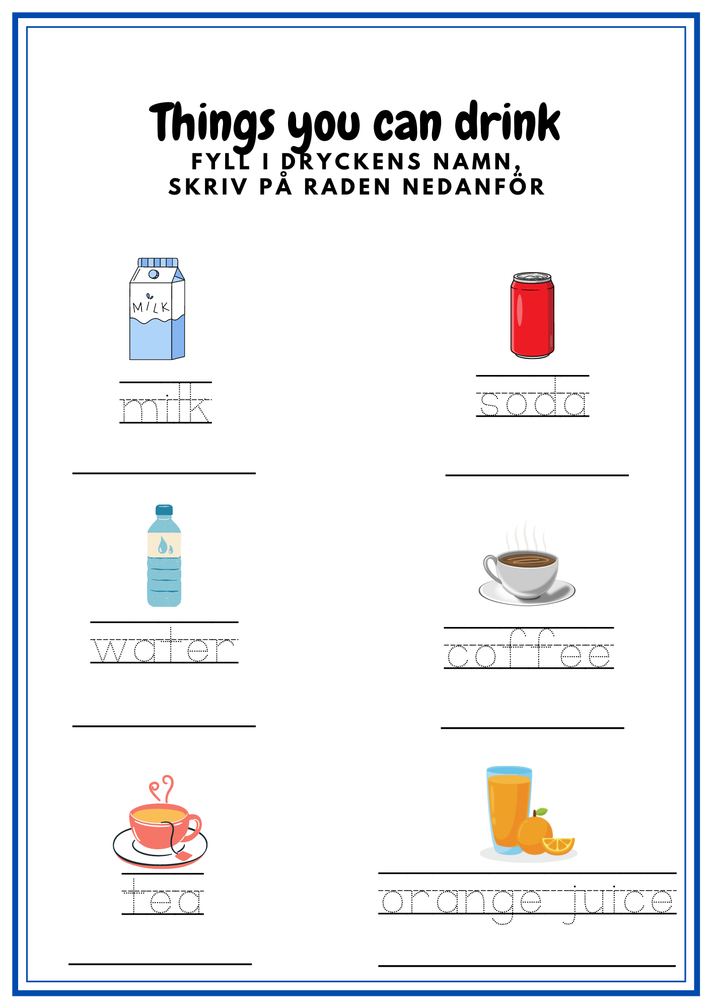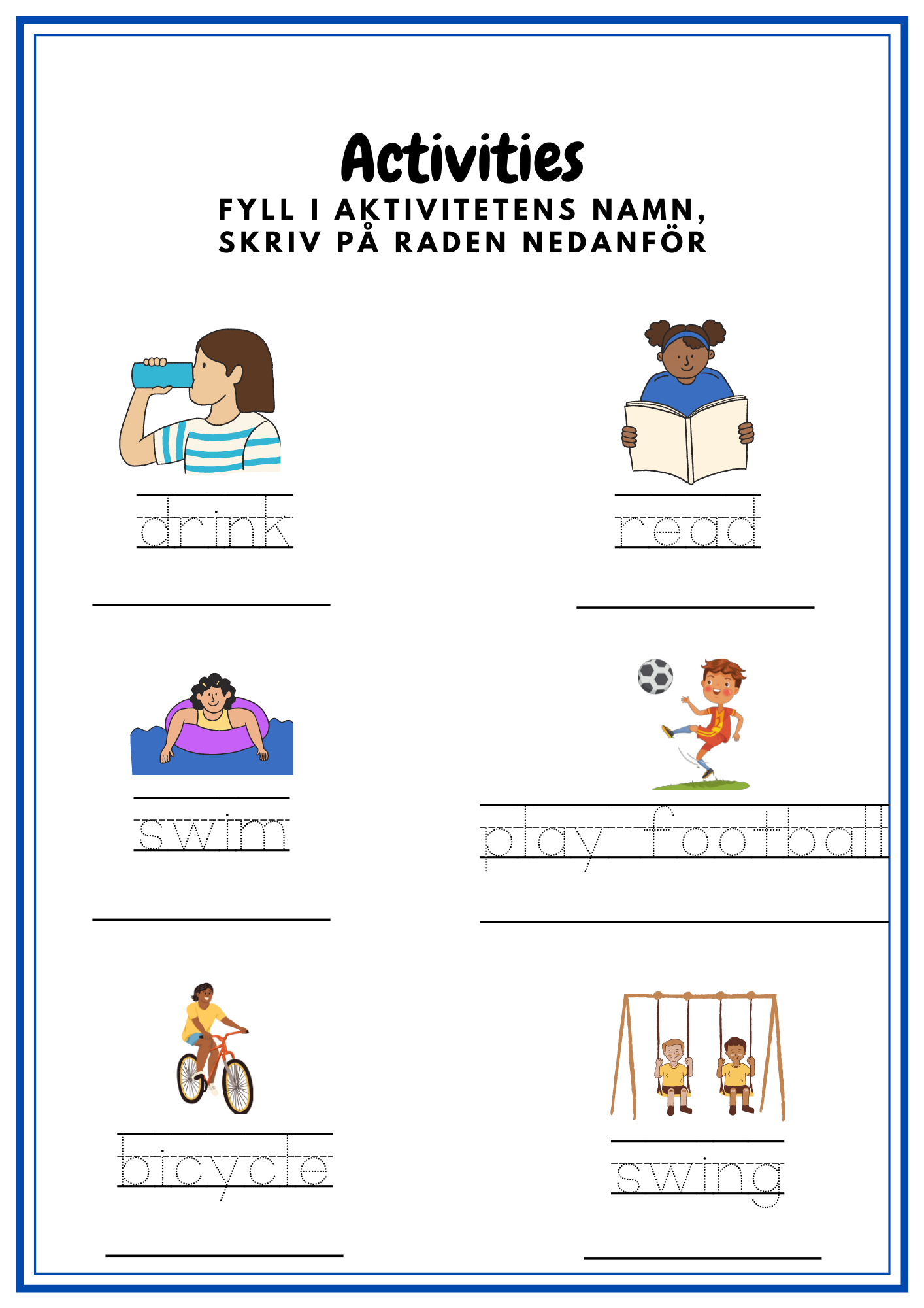 Häfte som tränar frukter, mat, dryck samt aktiviteter på engelska. Totalt 13 sidor + framsida.