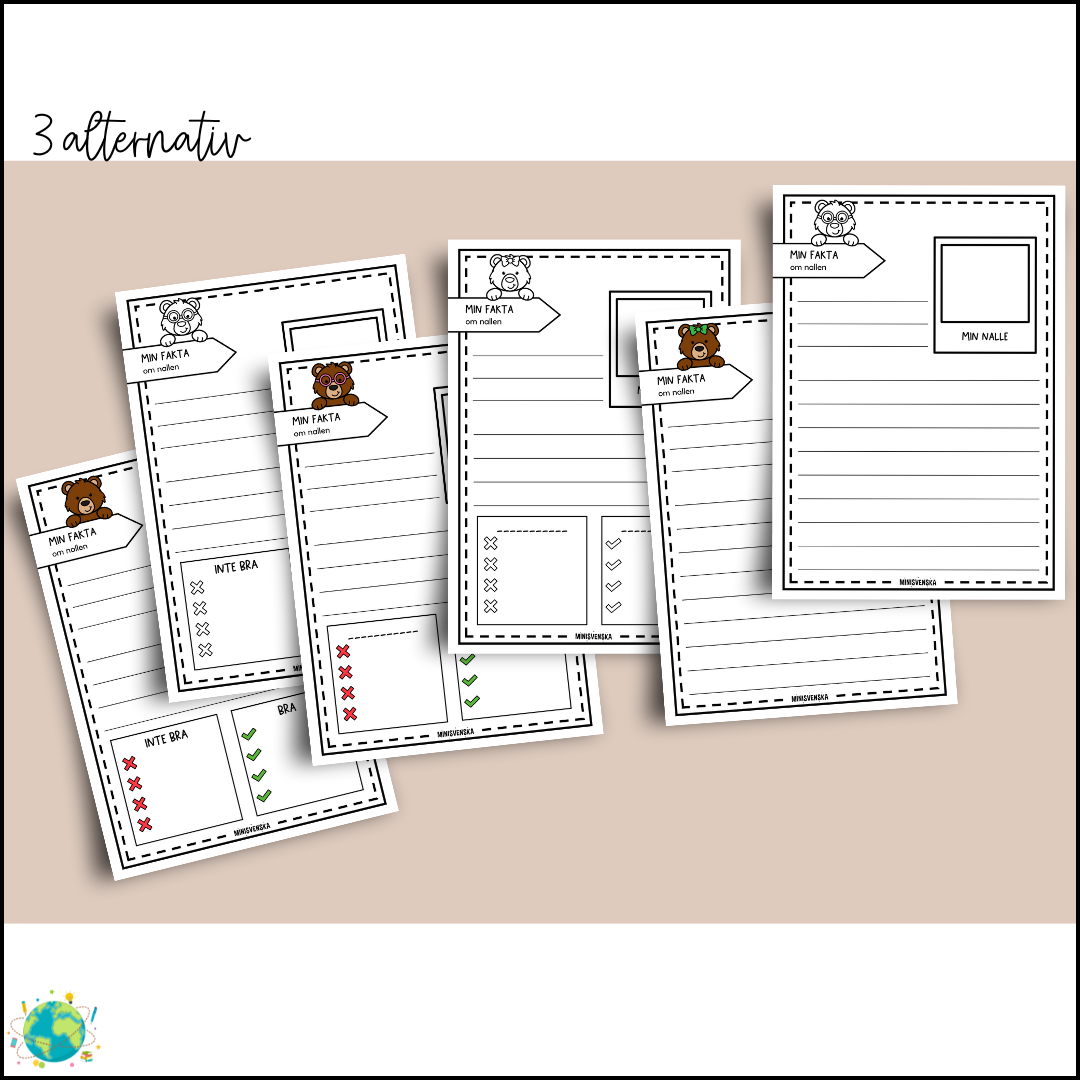 Skrivuppgifter till Nalledagen. PDF: A4 Innehåll: -Rita och skriv fakta om "Min nalle". Olika varianter: 3 nallar med färg: 3 alternativ 3 nallar utan färg: 3 alternativ - Skriv till bilden 4 bilder