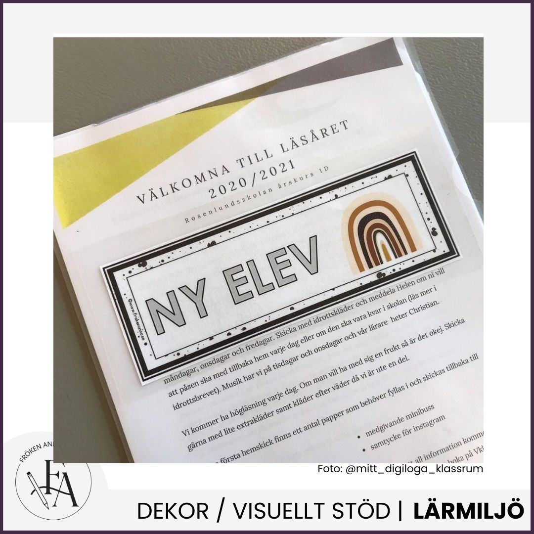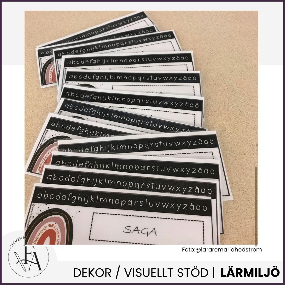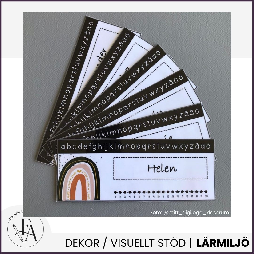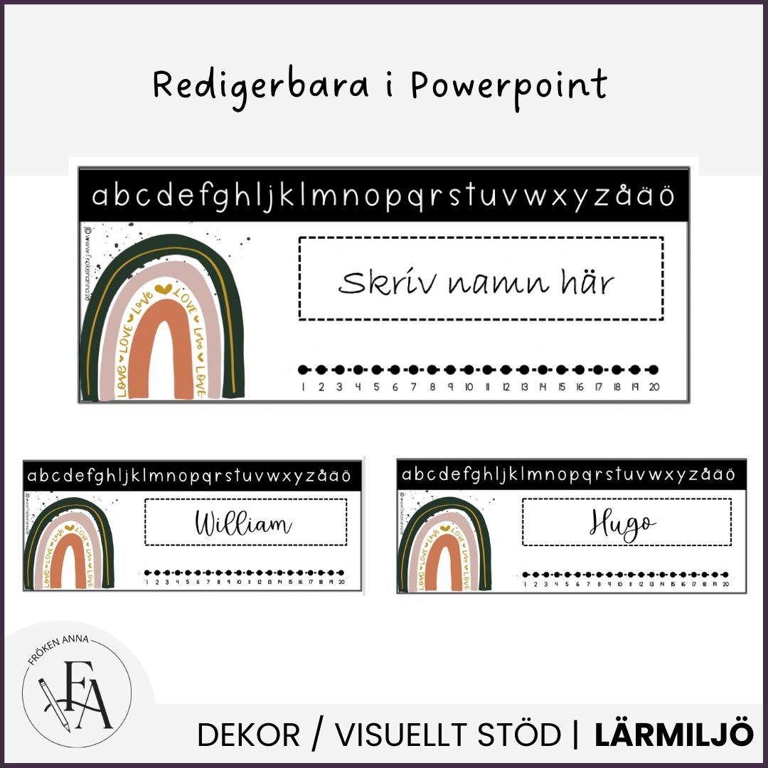 Rektangulär namnskylt i regnbågstema med alfabetet och talraden 1-20 som stöd. Namnskyltarna är redigerbara i Powerpoint och Keynote.