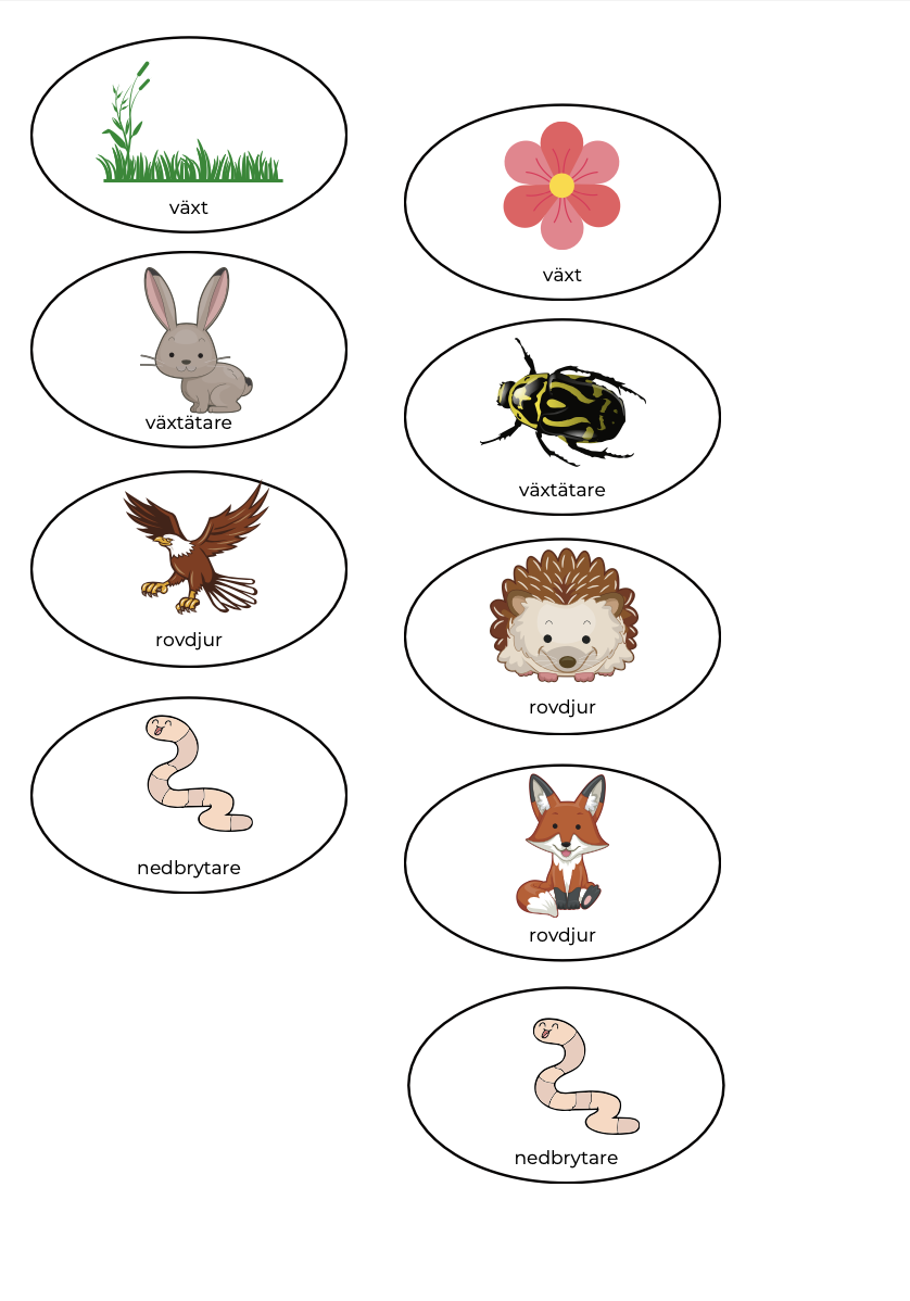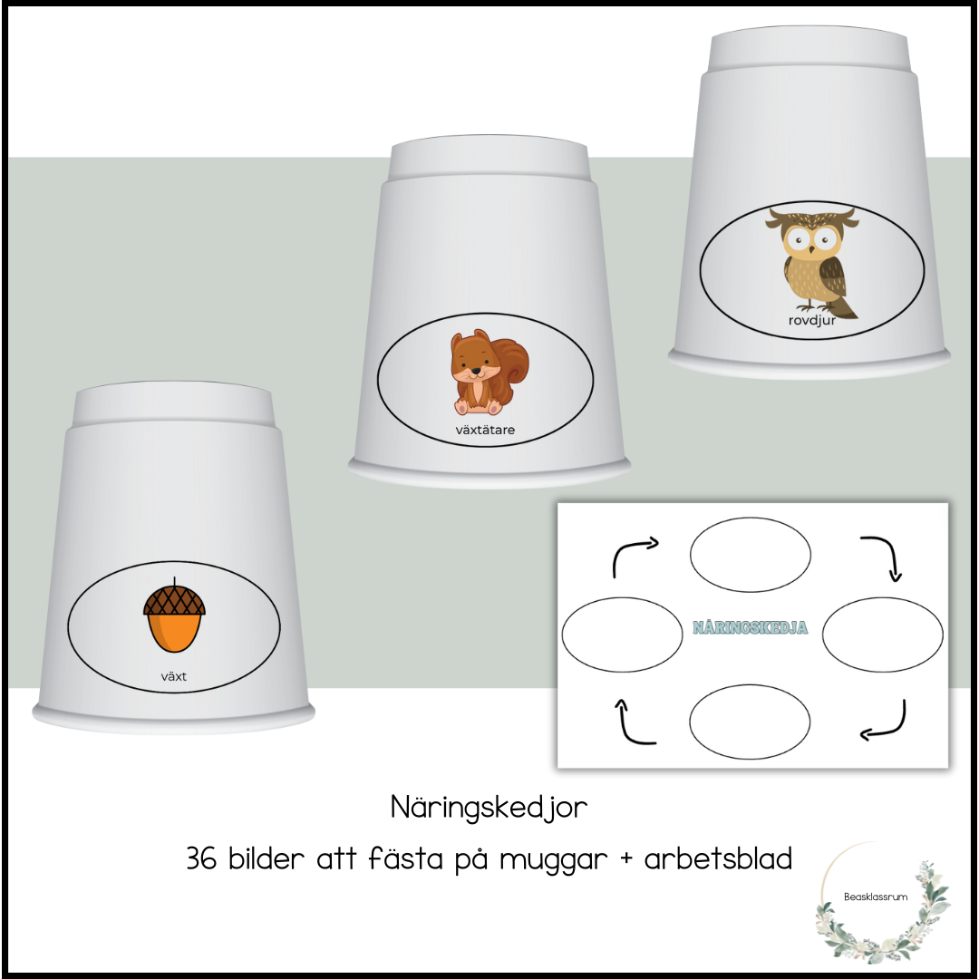 Medföljer även ett arbetsblad där eleverna kan välja ut en näringskedja och limma fast (samma bilder som till muggarna används).