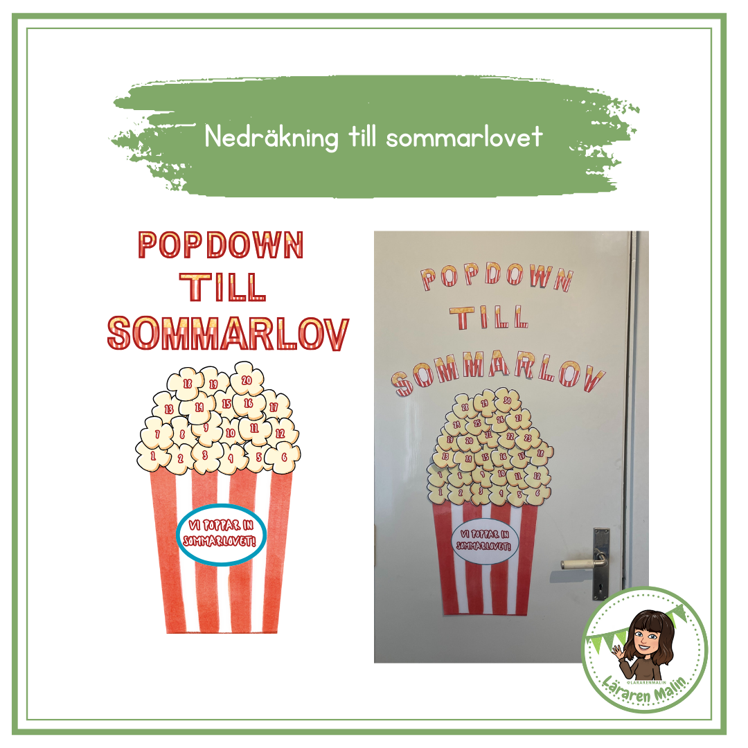 Nedräkning till sommarlovet- popdown till sommarlovet! Räkna ner till sommarlovet, ta bort ett popcorn för varje skoldag som går fram till sommarlovet.