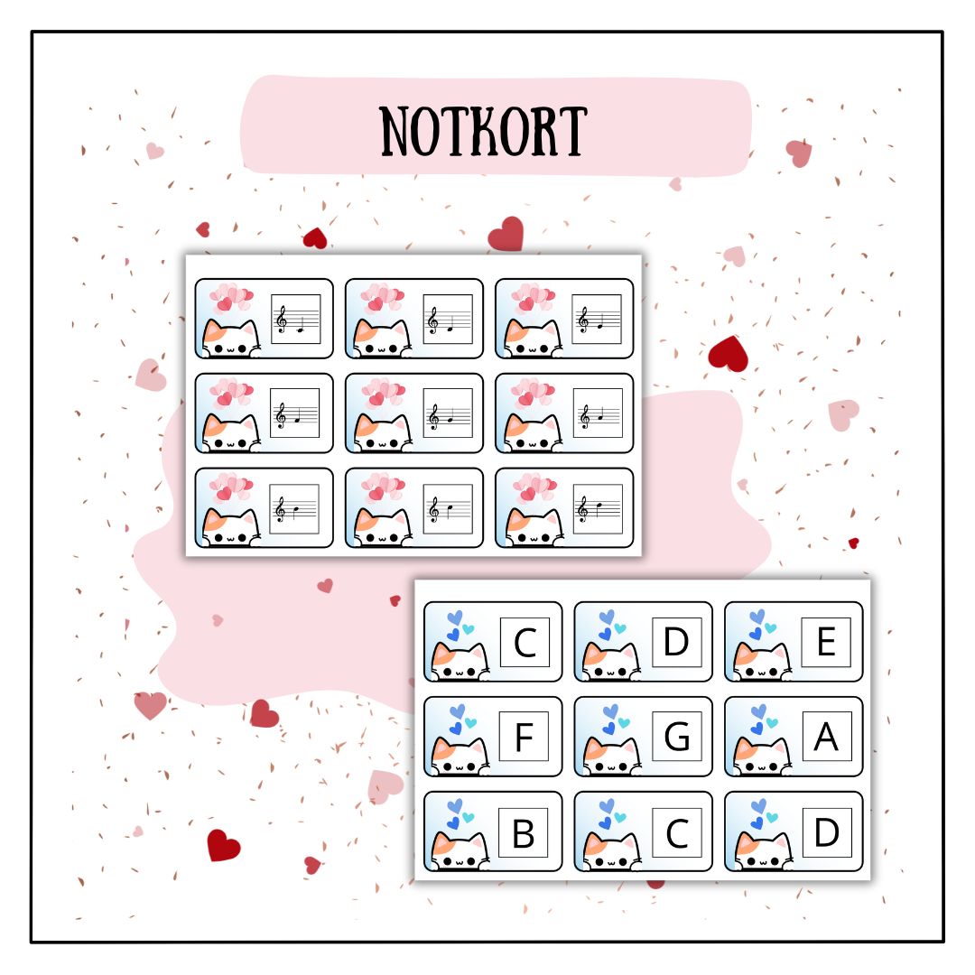 Notkort Alla hjärtans dag Fira Alla hjärtans dag med lekfulla notkort! Perfekta för musikundervisning eller spel hemma. Skriv ut, laminera och klipp ut korten. Använd dem för att matcha notbilder med tonnamn eller spela Memory!