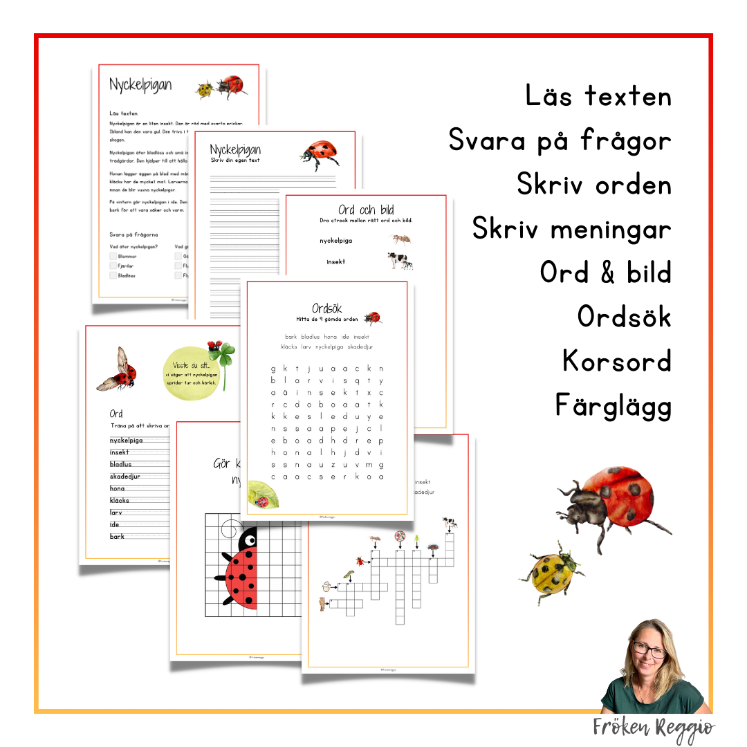 Nyckelpigan - Läs- och skrivträning Läs texten, svara på frågorna, skriv av texten och träna på att skriva orden. I materialet finns även övningar med korsord, ordsök och bild.