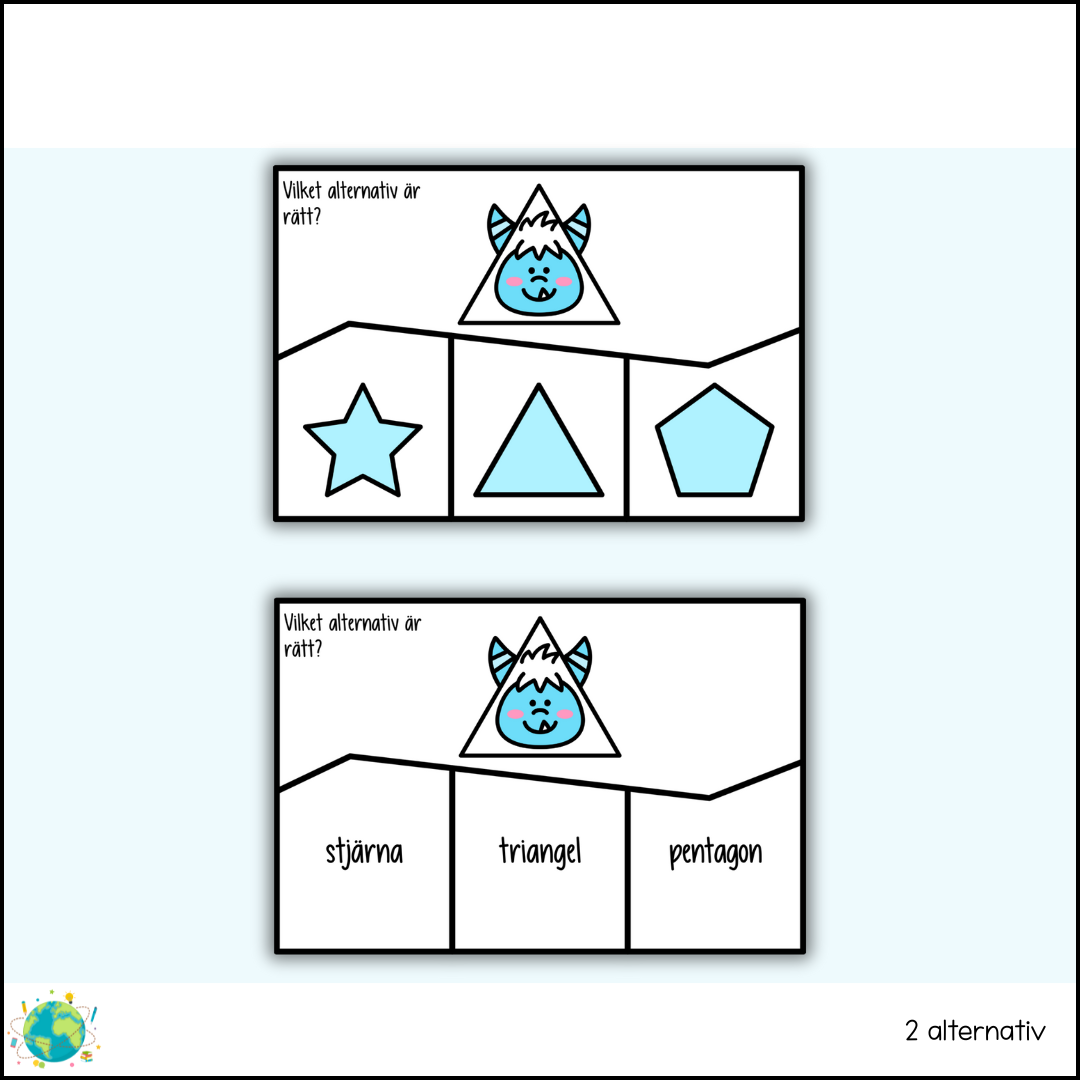 I detta material får barnen träna på geometriska former och begrepp med hjälp av nypkort med Yeti-tema. Barnen tittar på bilden och väljer vilket alternativ som är rätt genom att nypa eller markera rätt svar.