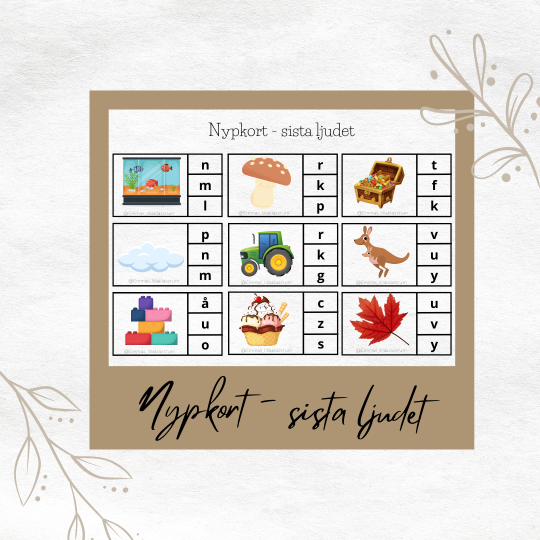 Materialet innehåller nypkort där eleverna får träna på sista ljudet. I materialet finns det både nypkort med versaler och gemener. Låt eleverna träna självständigt, använd materialet som en fråga fråga byt eller på de sättet som passar dina elever.