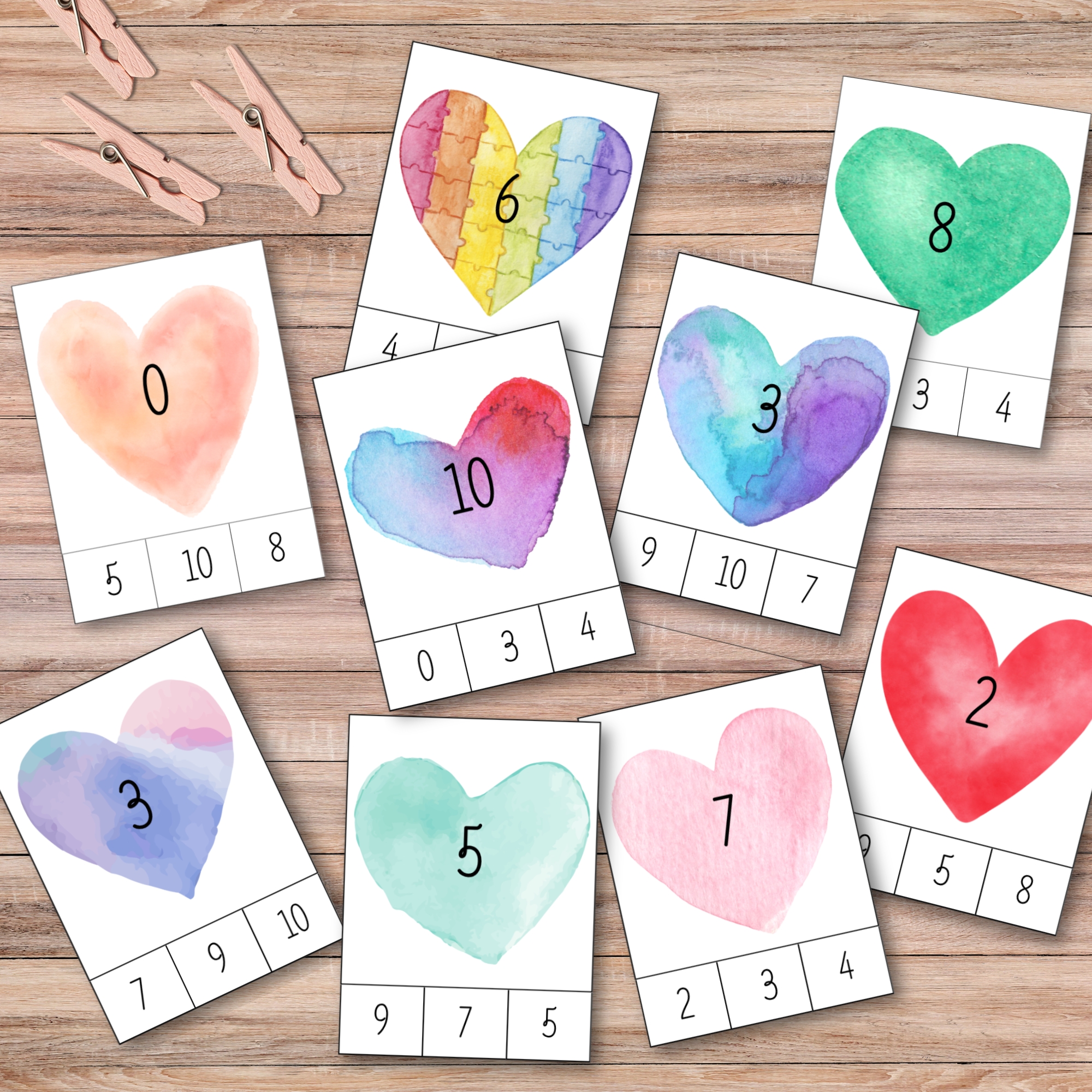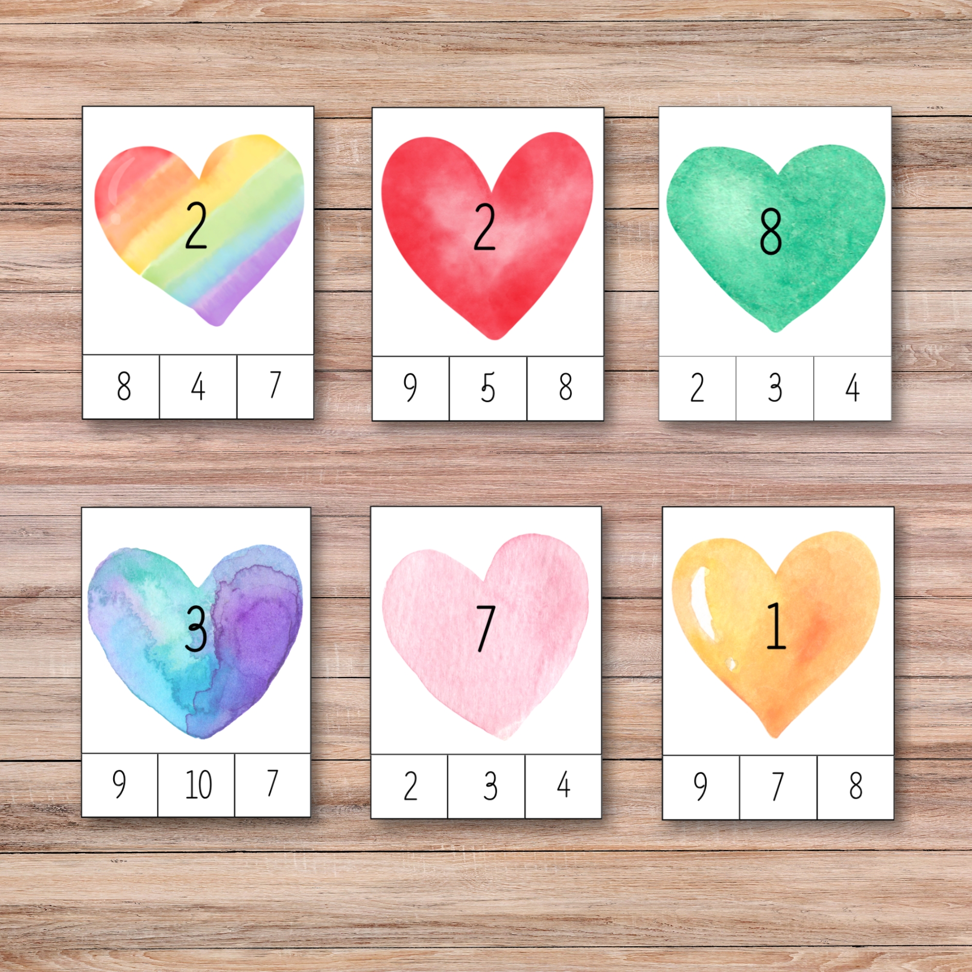 Räkna med hjärtan inför alla hjärtans dag! Träna tiokompisar på ett roligt sätt med dessa nypkort! 33 kort, 3 uppsättningar kort. Rätt svar markeras med en klädnypa, klämma eller ett gem.