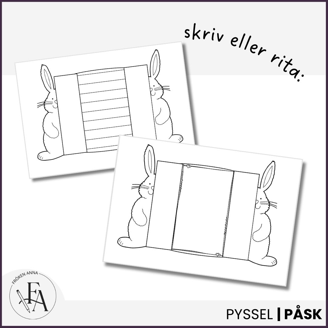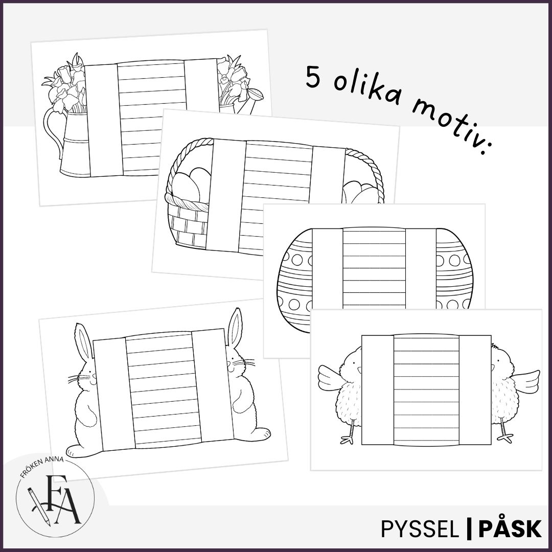 Skapa söta och roliga påskkort. Korten finns i färg och svartvitt för egen färgläggning Materialet innehåller: ❤️ Fem olika påskmotiv att välja bland. 💌 Fyra utföranden: med rader eller vit yta med plats för ett eget motiv, samt i färg. 🎨 Enkelt att skriva ut, färglägga och vika ihop. Använd korten som en trevlig påskhälsning till nära och kära, eller låt eleverna skapa egna fina kort i klassrummet inför påskfirandet.
