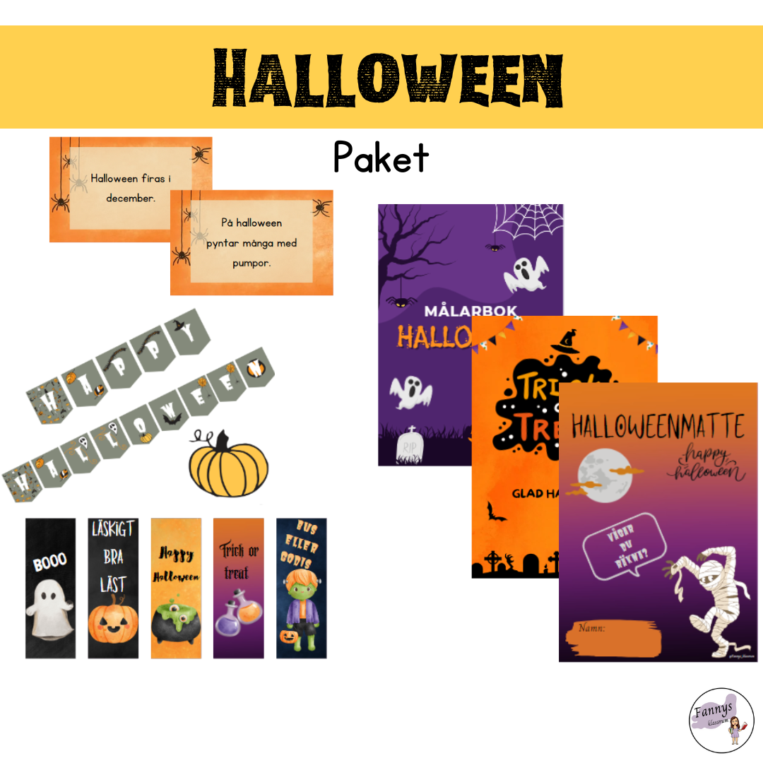 Paket med halloweentema. I materialet ingår: 2 olika halloweenhäften (se min butik för att se vad häftena innehåller) Målarbok med halloweentema Bokmärken Halloweenvimplar Sant eller falskt om halloween Värdet av produkterna är sammanlagt 80 kronor.
