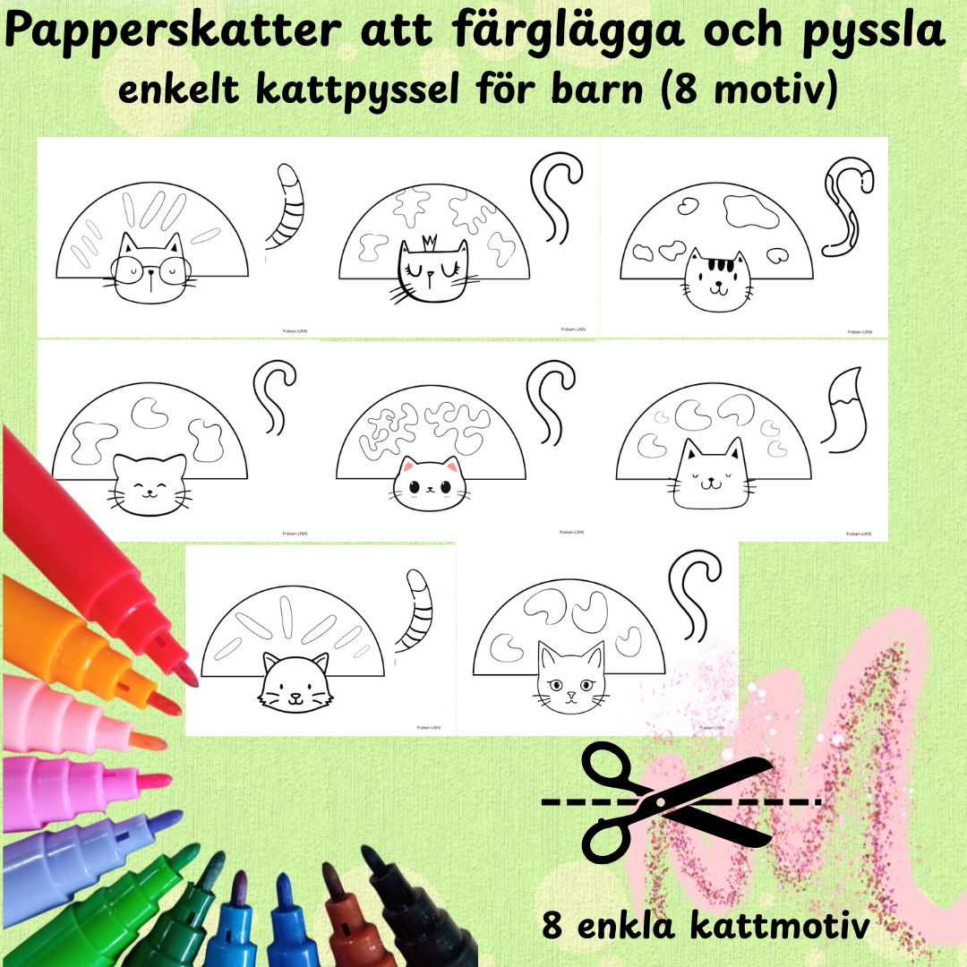 Papperskatter att färglägga och pyssla – enkelt kattpyssel för barn (8 motiv)