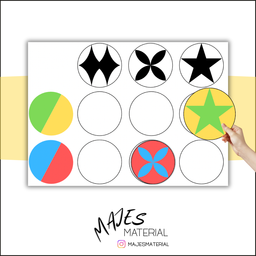 Med detta material kan barnen öva på matematik, känna igen mönster och para ihop. Materialet innehåller fyra brickor med olika färger samt två blad med de färdiga cirklarna (mönster och färg sammansatt).