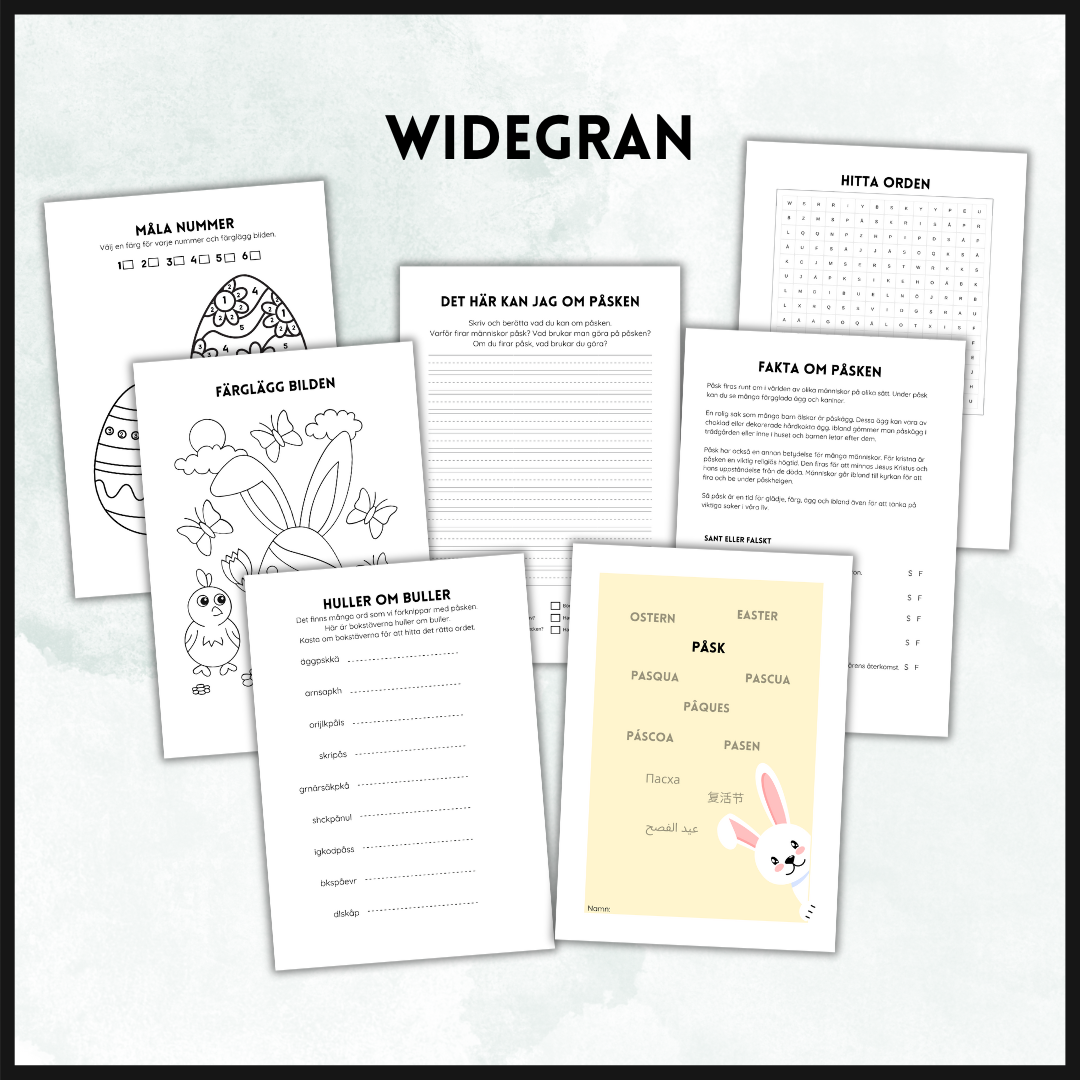 Ett arbetshäfte om påsken. – fakta om påsken – sant eller falskt – hitta orden – huller om buller – färglägg bilden – färglägg – måla nummer – det här kan jag om påsken