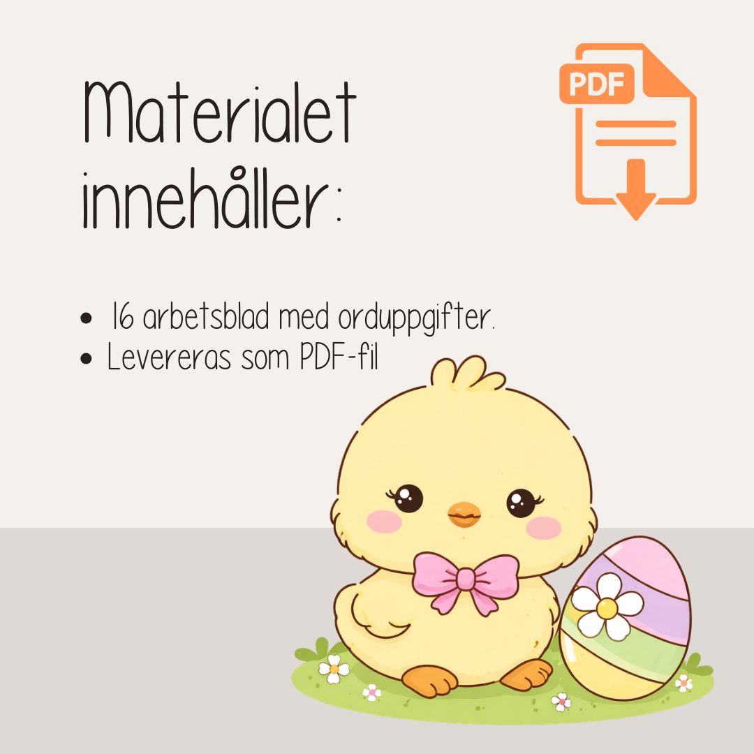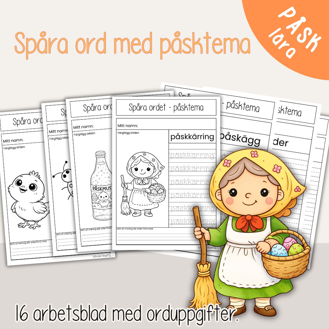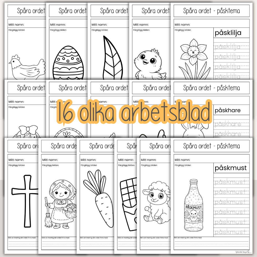 16 olika arbetsblad med uppgift att spåra ord med påsktema. Spåra ordet Färglägg bilden Skriv en mening Levereras som en PDF-fil