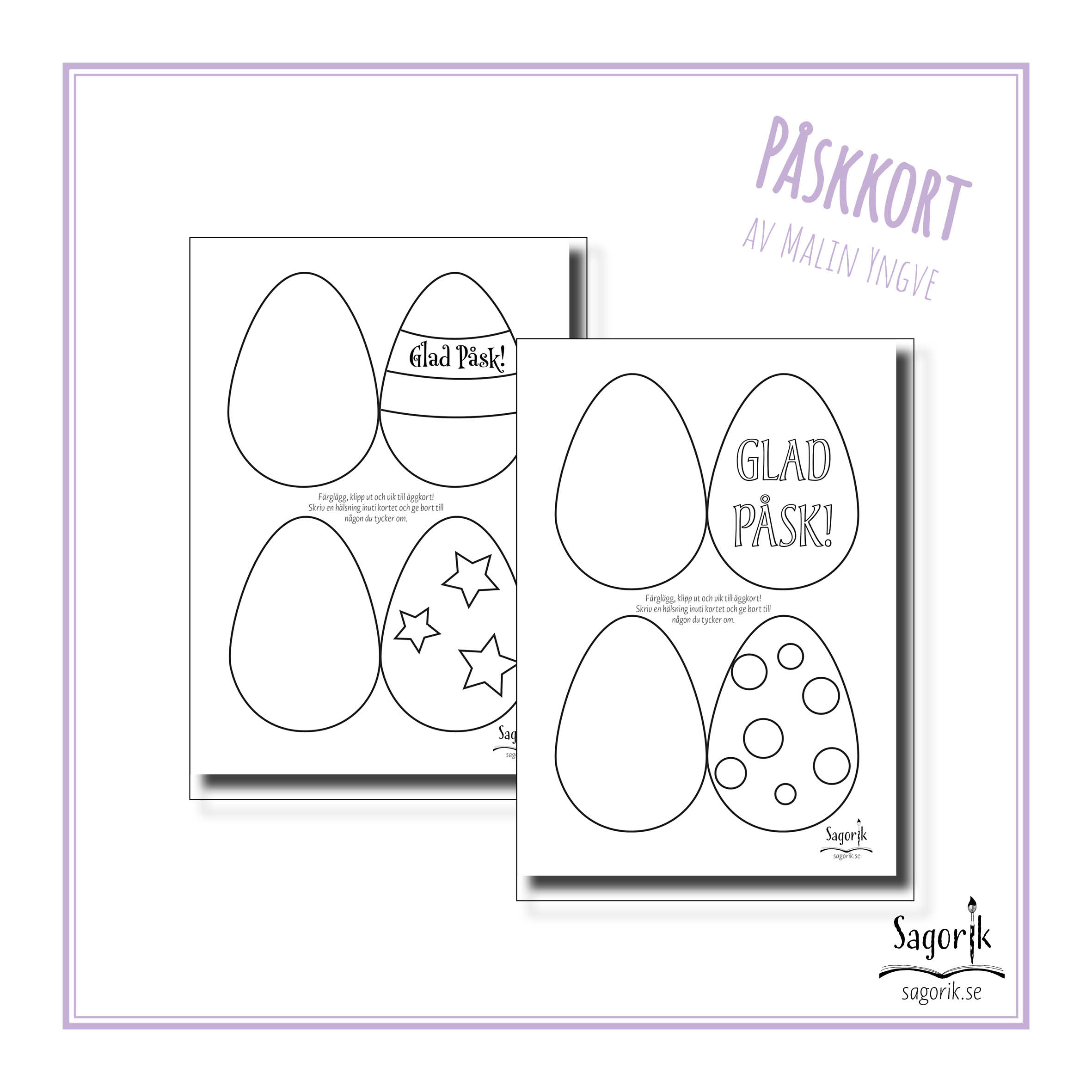 Äggformade påskkort att färglägga, klippa ut och vika. Inuti kan barnen sedan skriva sin hälsning. Kan användas till påskpysslet i förskolan, skolan eller på fritids. Motiv och design av Malin Yngve.