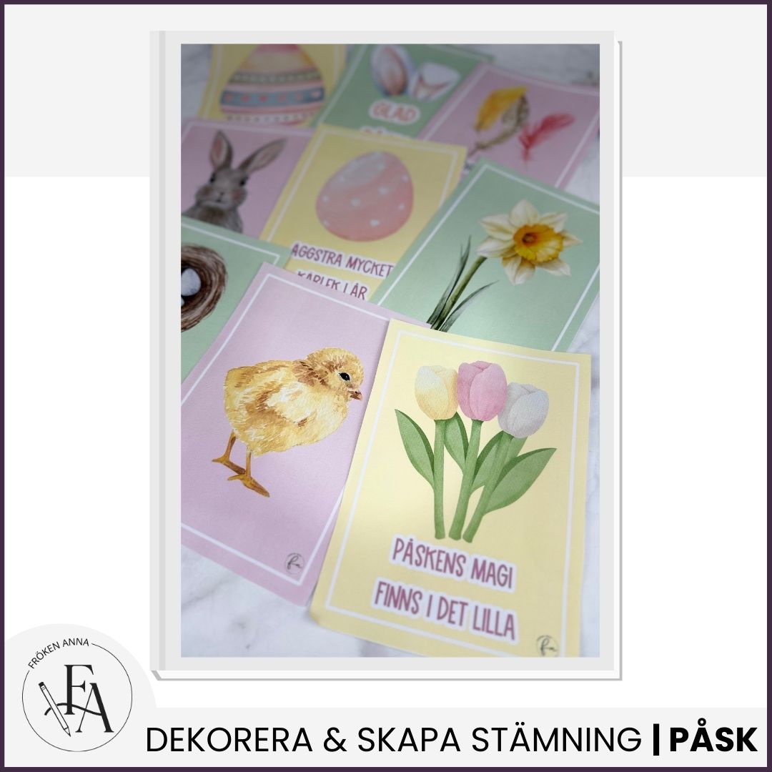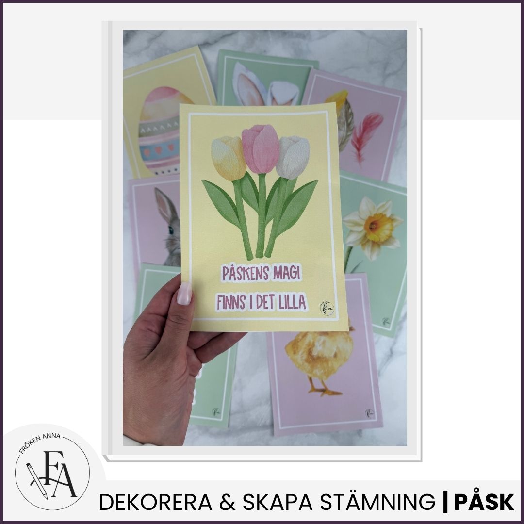 Det här materialet innehåller 9 färgglada posters med fina budskap och våriga färger – perfekta för att skapa en härlig påskstämning. Materialet levereras både som A4 och A5.