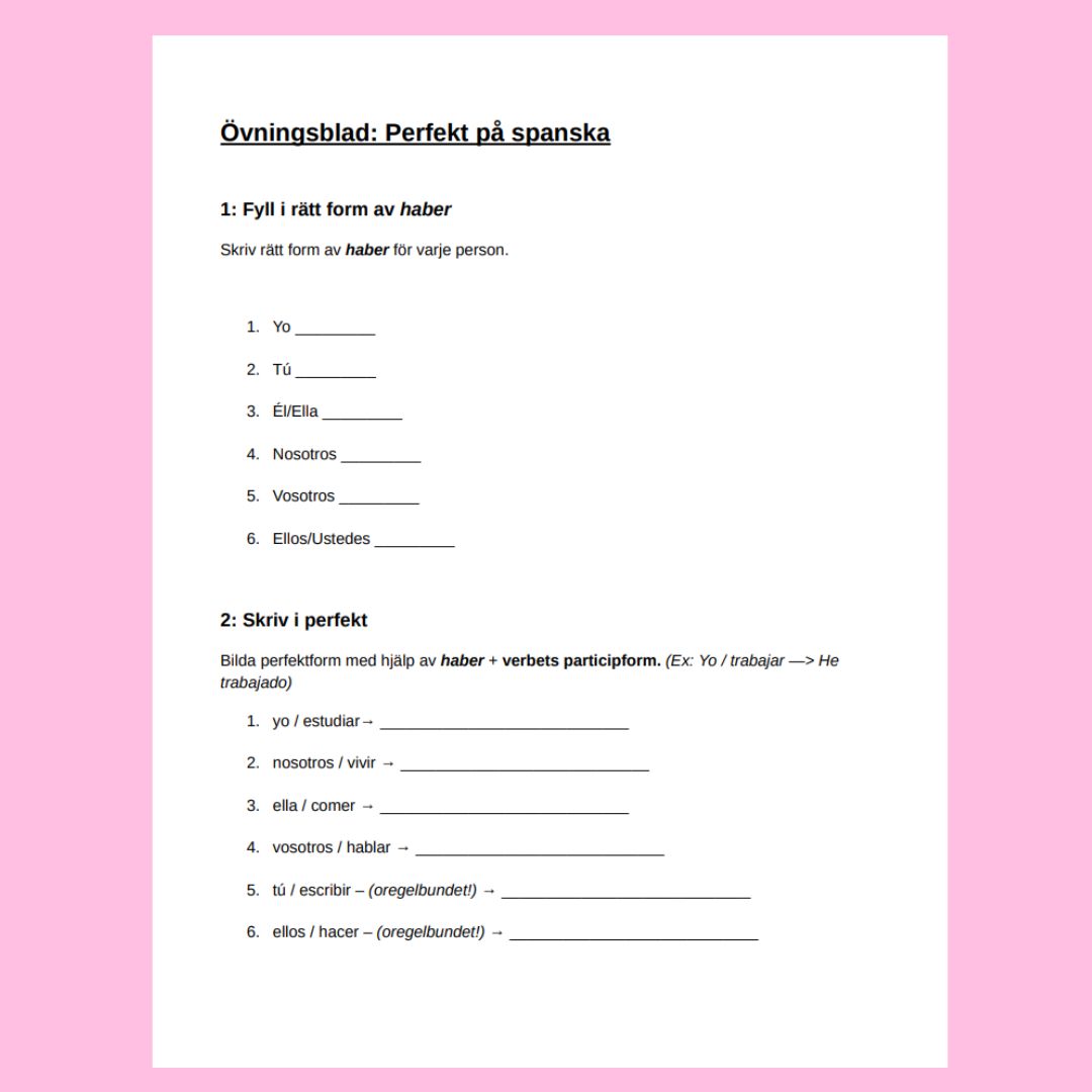 Ett komplett lektionspaket om tempusformen perfekt i spanska – perfekt för årskurs 8–9.