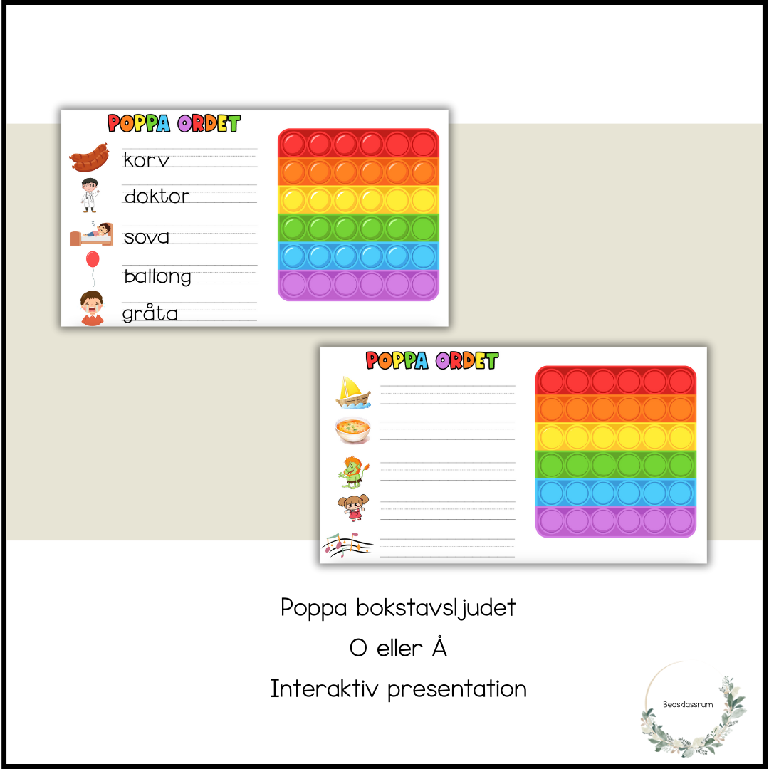 Filmad gif finns i miniatyrerna där du kan se hur materialet fungerar (filmen visar tj-ljud men upplägget är detsamma men ord med o eller å)