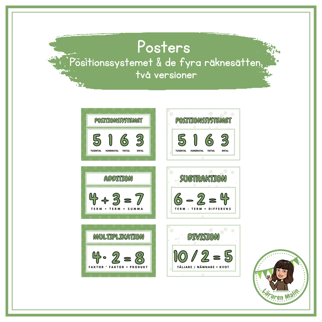 Posters med positionssystemet och de fyra räknesätten. Kommer i två versioner.