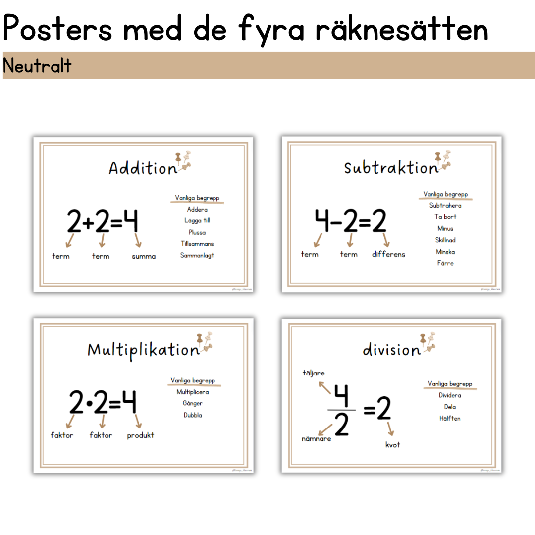 Posters med de fyra räknesätten. Ingår i mitt neutrala klassrumspaket.