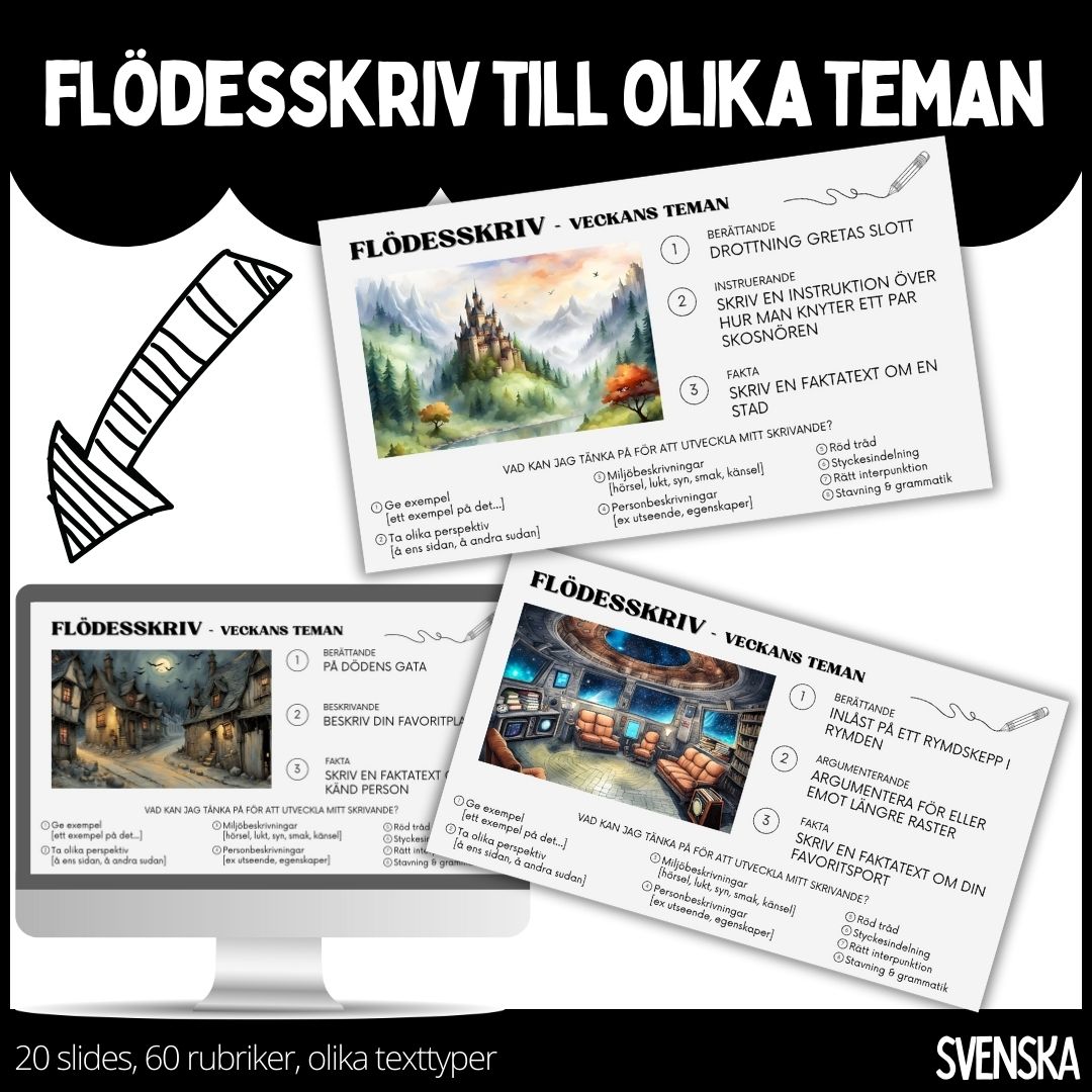 Låt eleverna öva på att skriva olika texter med hjälp av denna presentation. Presentationen innehåller 20 slides med 60 olika rubriker till olika texttyper samt en stödstruktur. Det varje slide har gemensamt är att de alla innehåller en bild / illustration samt en tillhörande rubrik till en berättande text. Presentationen är tänkt att ge eleverna möjligheten att fördjupa sina kunskaper och göra dem säkrare på att skriva olika slags texter. Låt eleverna själva välja rubrik och texttyp, låt dem skriva enskilt eller tillsammans i par eller grupp.