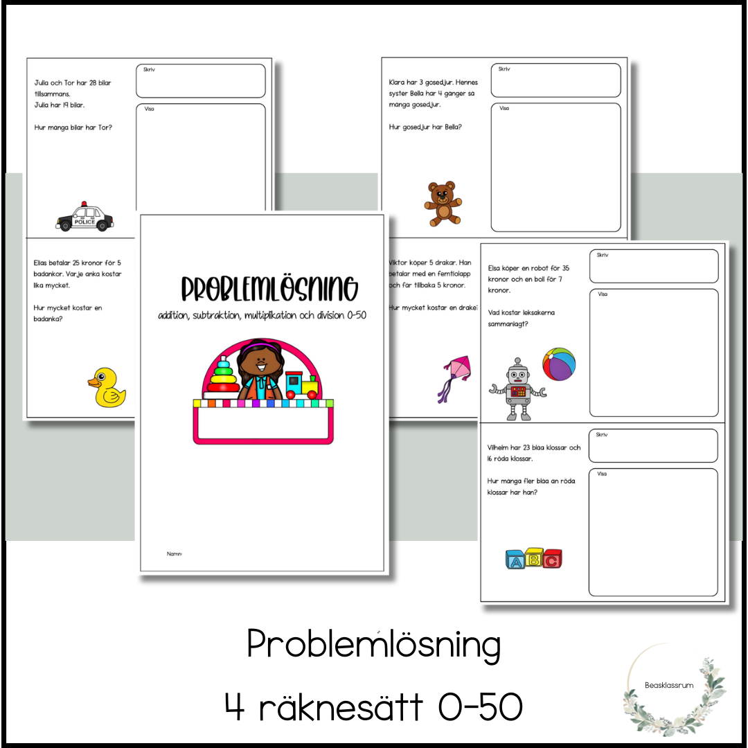 Häfte på 5 sidor där eleven tränar problemlösning i talområdet 0-50. Eleven tränar på att skriva matematiskt uttryck och visa med bild.