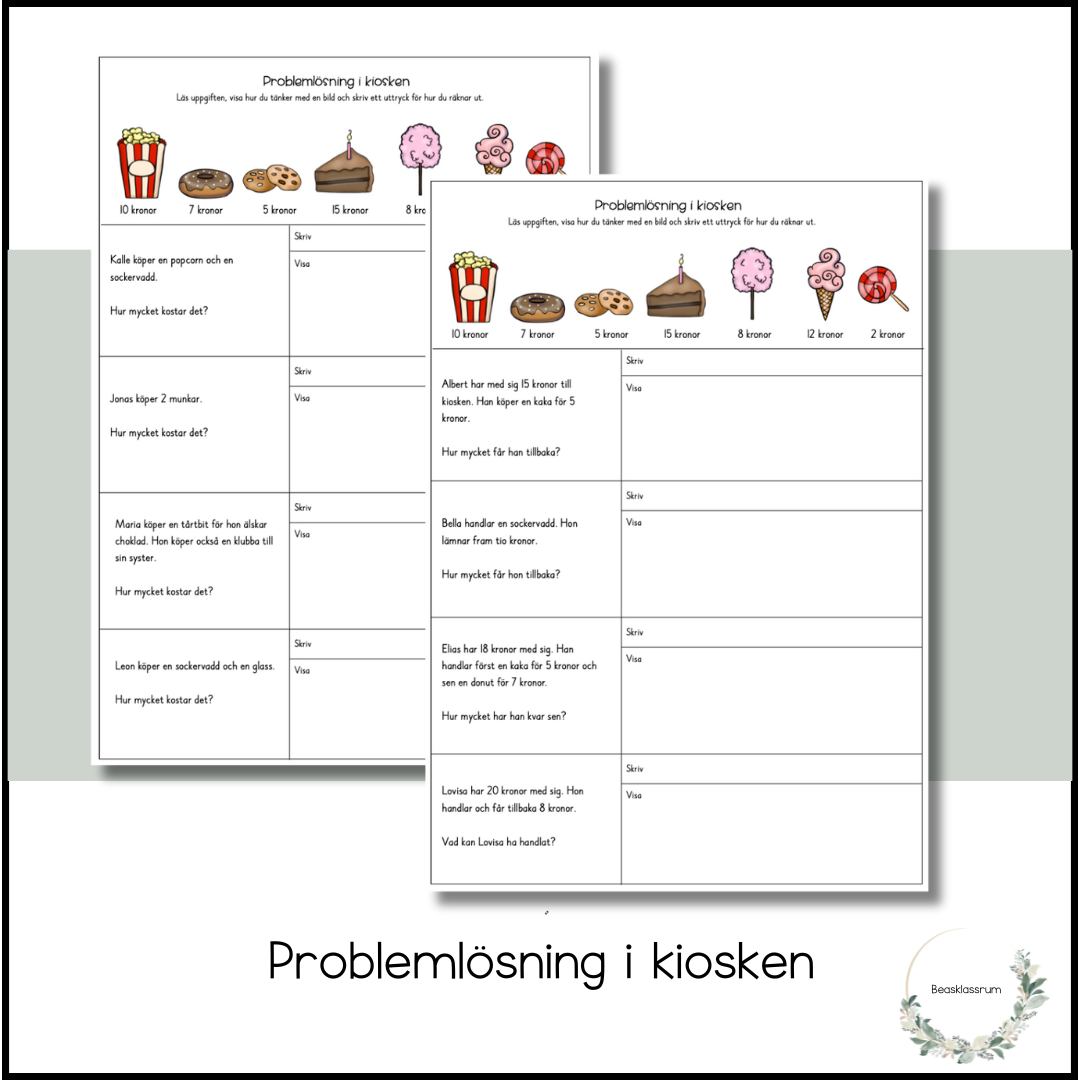 2 sidor med problemlösning (addition och subtraktion 0-20).