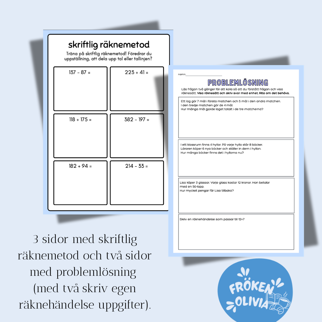 Här kan eleverna träna på skriftlig räknemetoder, problemlösning samt att skriva egen räknehändelse. Sammanlagt 5 sidor.